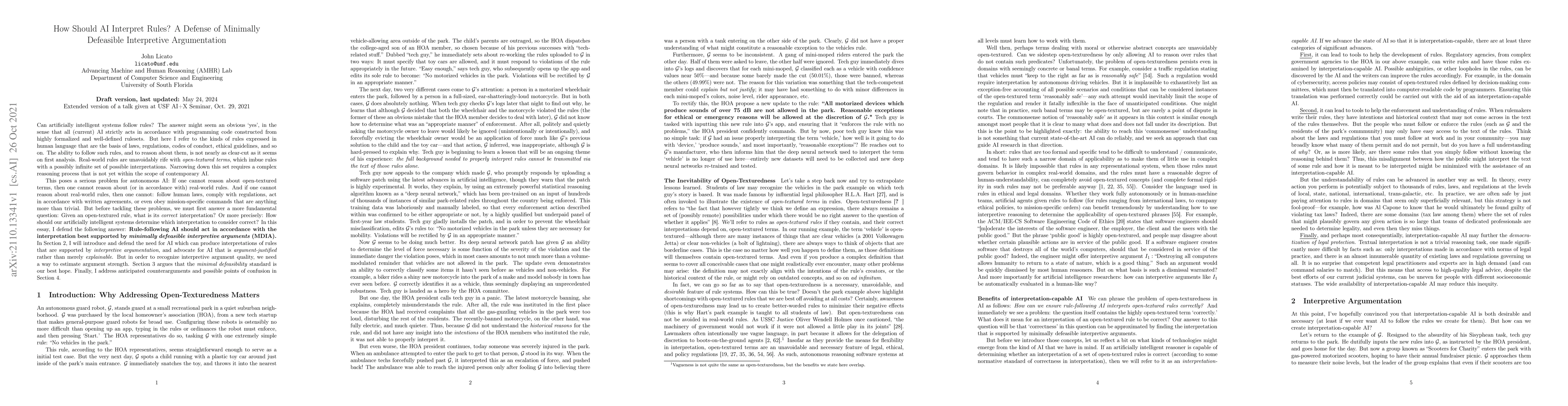 Can artificially intelligent systems follow rules? The answer might seem an obvious `yes', in the sense that all (current) AI strictly acts in accordance with programming code constructed from highly formalized and well-defined rulesets. But here I refer to the kinds of rules expressed in human language that are the basis of laws, regulations, codes of conduct, ethical guidelines, and so on. The ability to follow such rules, and to reason about them, is not nearly as clear-cut as it seems on first analysis. Real-world rules are unavoidably rife with open-textured terms, which imbue rules with a possibly infinite set of possible interpretations. Narrowing down this set requires a complex reasoning process that is not yet within the scope of contemporary AI. This poses a serious problem for autonomous AI: If one cannot reason about open-textured terms, then one cannot reason about (or in accordance with) real-world rules. And if one cannot reason about real-world rules, then one cannot: follow human laws, comply with regulations, act in accordance with written agreements, or even obey mission-specific commands that are anything more than trivial. But before tackling these problems, we must first answer a more fundamental question: Given an open-textured rule, what is its correct interpretation? Or more precisely: How should our artificially intelligent systems determine which interpretation to consider correct? In this essay, I defend the following answer: Rule-following AI should act in accordance with the interpretation best supported by minimally defeasible interpretive arguments (MDIA).