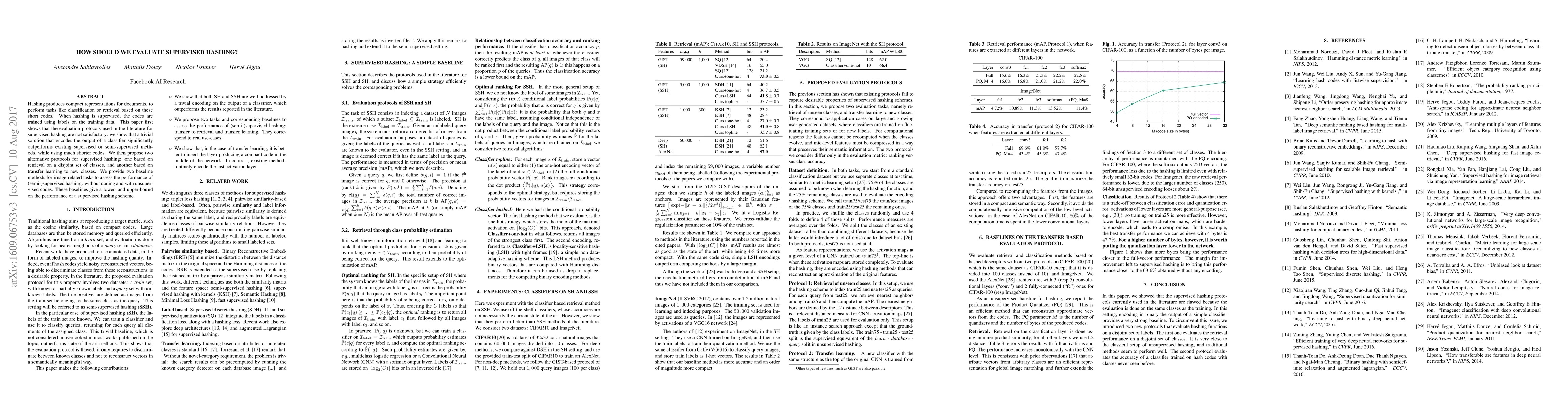 Research paper critiques existing evaluation protocols for supervised hashing, proposing two new methods: retrieval-based and transfer learning approaches. Existing methods are shown to be outperformed by a trivial solution that uses shorter codes.