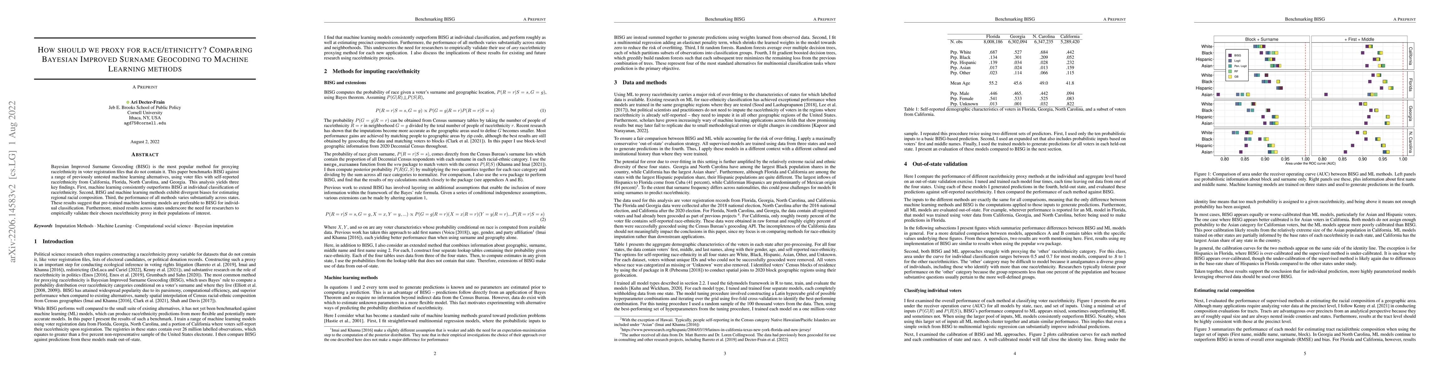 This paper compares Bayesian Improved Surname Geocoding (BISG) with machine learning methods for proxying race/ethnicity in voter registration files. Machine learning consistently outperforms BISG in individual classification but exhibits divergent biases in regional racial composition estimates, with varying performance across different states.