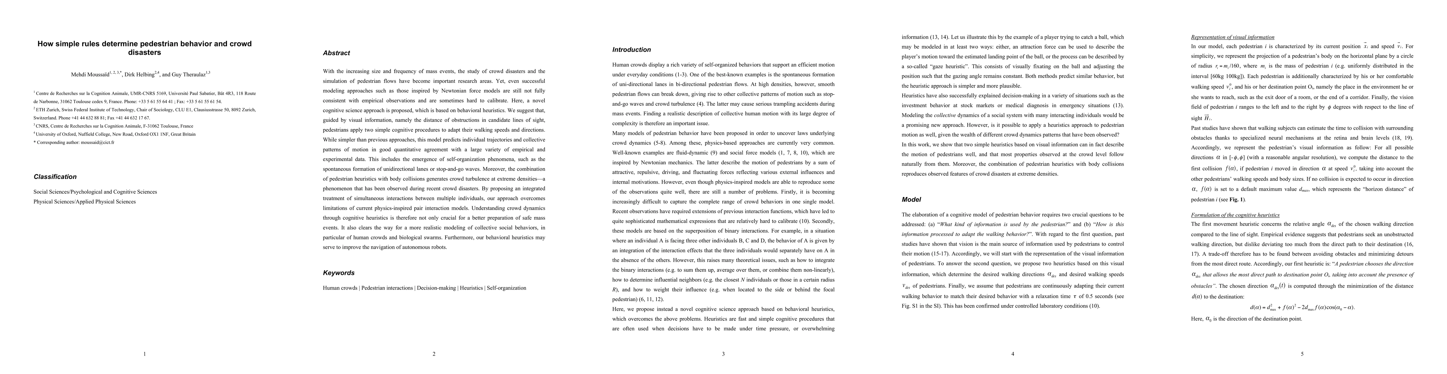 This paper proposes a cognitive science approach to model pedestrian behavior and crowd disasters, suggesting that simple heuristics based on visual information and distance to obstructions guide individuals' movement. This heuristic-based model accurately predicts collective patterns and self-organization phenomena, addressing limitations of physics-based models and offering insights for safer mass events and autonomous robot navigation.
