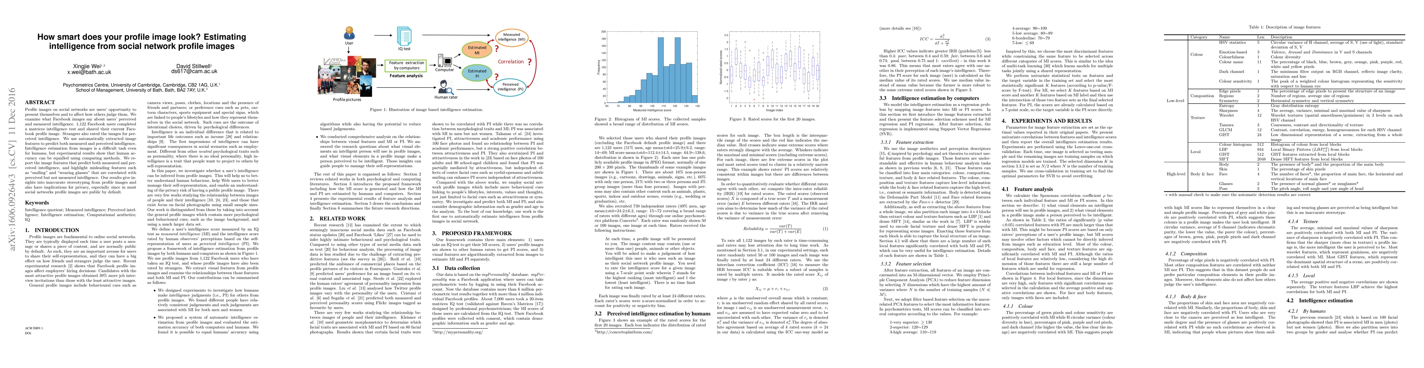 Profile images on social networks are users' opportunity to present themselves and to affect how others judge them. We examine what Facebook images say about users' perceived and measured intelligence. 1,122 Facebook users completed a matrices intelligence test and shared their current Facebook profile image. Strangers also rated the images for perceived intelligence. We use automatically extracted image features to predict both measured and perceived intelligence. Intelligence estimation from images is a difficult task even for humans, but experimental results show that human accuracy can be equalled using computing methods. We report the image features that predict both measured and perceived intelligence, and highlight misleading features such as "smiling" and "wearing glasses" that are correlated with perceived but not measured intelligence. Our results give insights into inaccurate stereotyping from profile images and also have implications for privacy, especially since in most social networks profile images are public by default.