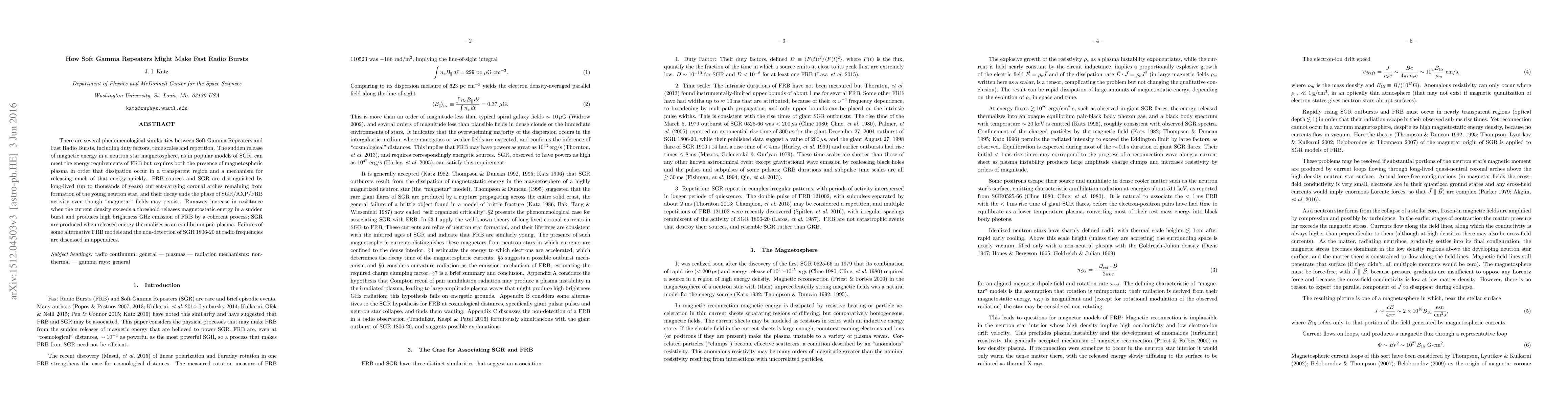 There are several phenomenological similarities between Soft Gamma Repeaters and Fast Radio Bursts, including duty factors, time scales and probable repetition. The sudden release of magnetic energy in a neutron star magnetosphere, as in popular models of SGR, can meet the energy requirements of FRB but requires both the presence of magnetospheric plasma in order that dissipation occur in a transparent region and a mechanism for releasing much of that energy quickly. FRB sources and SGR are distinguished by long-lived (up to thousands of years) current-carrying coronal arches remaining from formation of the young neutron star and their decay ends the phase of SGR/AXP/FRB activity even though "magnetar" fields may persist. Runaway increase in resistance when the current density exceeds a threshold releases magnetostatic energy in a sudden burst and produces high brightness GHz emission of FRB by a coherent process; SGR are produced when released energy thermalizes as an equilibrium pair plasma. Failures of some alternative FRB models and the non-detection of SGR~1806-20 at radio frequencies are discussed in appendices.