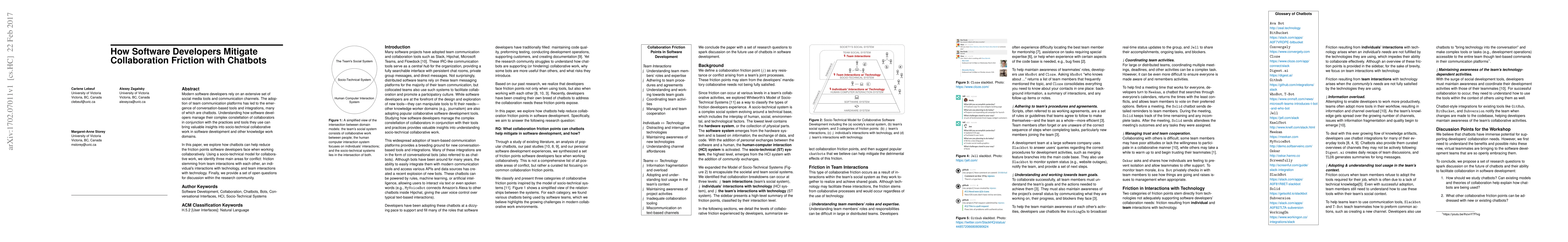 This paper explores how chatbots can reduce collaboration friction for software developers by addressing team interactions, individual technology issues, and team-technology conflicts. It provides open questions for discussion to further understand the impact of chatbots on socio-technical collaborative work.