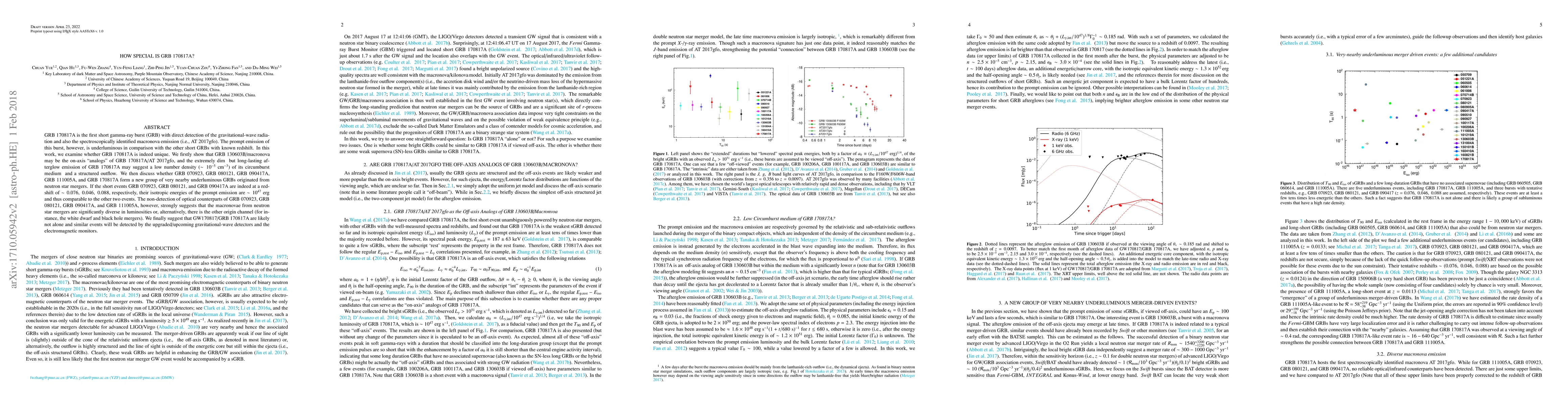 GRB 170817A is the first short gamma-ray burst (GRB) with direct detection of the gravitational-wave radiation and also the spectroscopically identified macronova emission (i.e., AT 2017gfo). The prompt emission of this burst, however, is underluminous in comparison with the other short GRBs with known redshift. In this work, we examine whether GRB 170817A is indeed unique. We firstly show that GRB 130603B/macronova may be the on-axis "analogs" of GRB 170817A/AT 2017gfo, and the extremely dim { but long-lasting} afterglow emission of GRB 170817A may suggest a low number density ($\sim 10^{-5}~{\rm cm^{-3}}$) of its circumburst medium { and a structured outflow}. We then discuss whether GRB 070923, GRB 080121, GRB 090417A, GRB 111005A, and GRB 170817A form a new group of very nearby underluminous GRBs originated from neutron star mergers. If the short events GRB 070923, GRB 080121, and GRB 090417A are indeed at a redshift of $\sim 0.076,~0.046,~0.088$, respectively, their isotropic energies of the prompt emission are $\sim 10^{47}$ erg and thus comparable to the other two events. The non-detection of optical counterparts of GRB 070923, GRB 080121, GRB 090417A, and GRB 111005A, however, strongly suggests that the macronovae from neutron star mergers are significantly diverse in luminosities or, alternatively, there is the other origin channel (for instance, the white dwarf and black hole mergers). We finally suggest that GW170817/GRB 170817A are likely not alone and similar events will be detected by the upgraded/upcoming gravitational-wave detectors and the electromagnetic monitors.