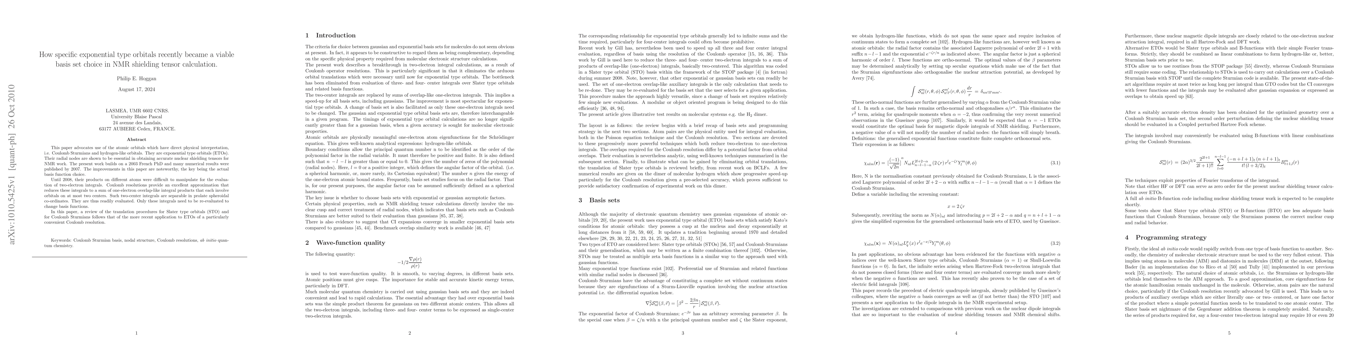 This paper advocates use of the atomic orbitals which have direct physical interpretation, i.e. Coulomb Sturmians and hydrogen-like orbitals. They are exponential type orbitals (ETOs). Their radial nodes are shown to be essential in obtaining accurate nuclear shielding tensors for NMR work. The present work builds on a 2003 French PhD and many numerical results were published by 2007. The improvements in this paper are noteworthy, the key being the actual basis function choice. Until 2008, their products on different atoms were difficult to manipulate for the evaluation of two-electron integrals. Coulomb resolutions provide an excellent approximation that reduces these integrals to a sum of one-electron overlap-like integral products that each involve orbitals on at most two centers. Such two-center integrals are separable in prolate spheroidal co-ordinates. They are thus readily evaluated. Only these integrals need to be re-evaluated to change basis functions. In this paper, a review of the translation procedures for Slater type orbitals (STO) and for Coulomb Sturmians follows that of the more recent application to ETOs of a particularly convenient Coulomb resolution.