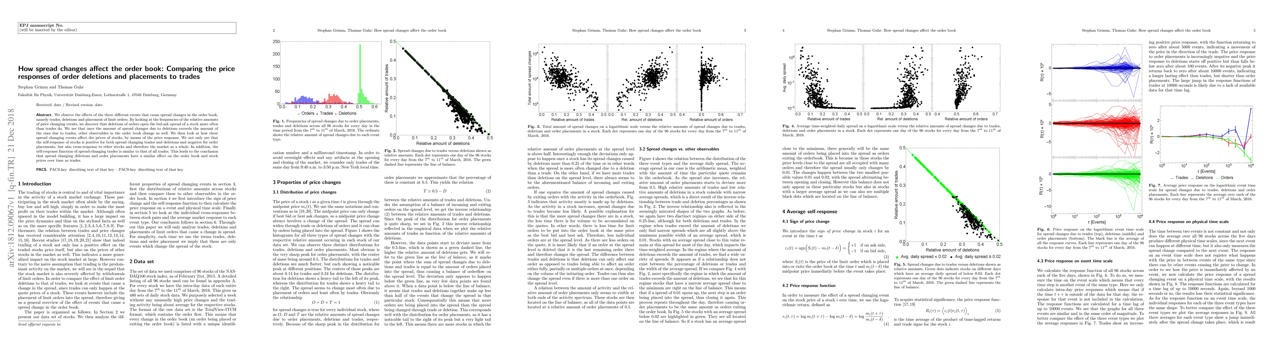 We observe the effects of the three different events that cause spread changes in the order book, namely trades, deletions and placement of limit orders. By looking at the frequencies of the relative amounts of price changing events, we discover that deletions of orders open the bid-ask spread of a stock more often than trades do. We see that once the amount of spread changes due to deletions exceeds the amount of the ones due to trades, other observables in the order book change as well. We then look at how these spread changing events affect the prices of stocks, by means of the price response. We not only see that the self-response of stocks is positive for both spread changing trades and deletions and negative for order placements, but also cross-response to other stocks and therefore the market as a whole. In addition, the self-response function of spread-changing trades is similar to that of all trades. This leads to the conclusion that spread changing deletions and order placements have a similar effect on the order book and stock prices over time as trades.