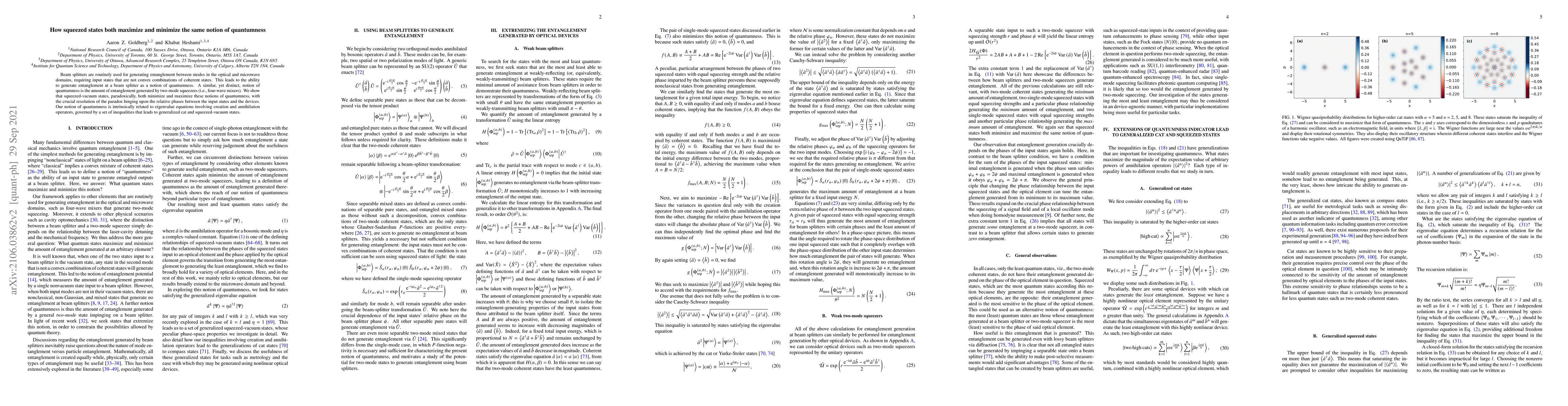 This paper explores how squeezed-vacuum states can simultaneously maximize and minimize different notions of quantumness, specifically in the context of entanglement generation by beam splitters and two-mode squeezers. The resolution of this paradox depends on the relative phases between input states and the devices, revealing a nuanced relationship governed by eigenvalue equations and inequalities.
