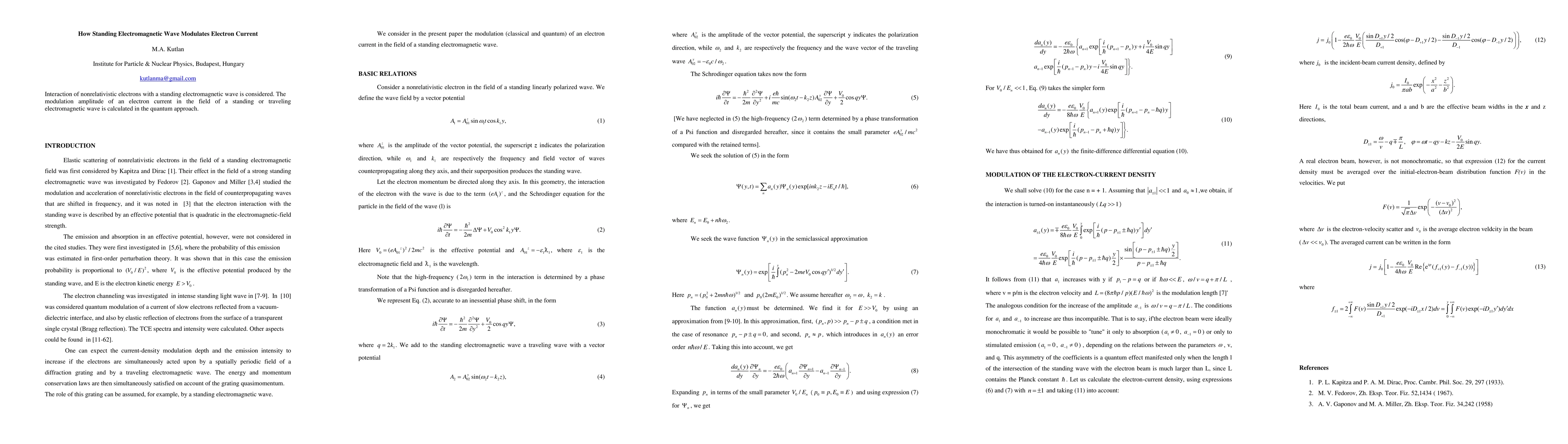 This paper investigates the interaction of nonrelativistic electrons with a standing electromagnetic wave, calculating the modulation amplitude of electron current using a quantum approach. The results provide insight into how standing waves influence electron dynamics.