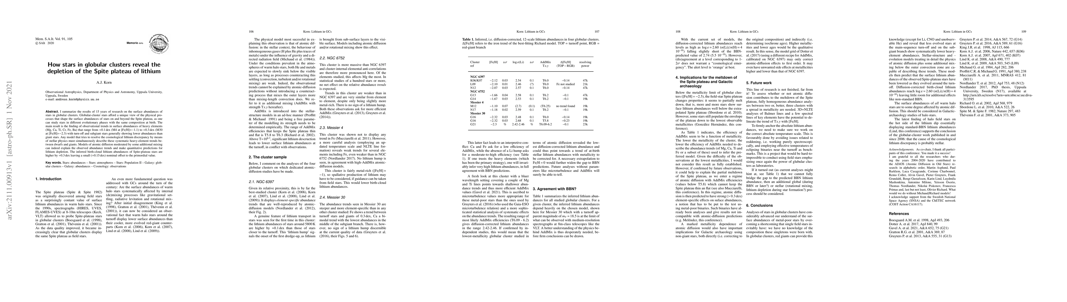 I summarize the results of 15 years of research on the surface abundances of stars in globular clusters. Globular-cluster stars afford a unique view of the physical processes that shape the surface abundances of stars on and beyond the Spite plateau, as one can study stars in different evolutionary phases with the same composition at birth. The main result is the finding of observational trends in surface abundances of heavy elements (Mg, Ca, Ti, Cr, Fe, Ba) that range from ~0.1 dex (M4 at [Fe/H]=-1.1) to ~0.3 dex (M30 at [Fe/H]=-2.3) with turn-off and subgiant stars generally showing lower abundances than giant stars. Any model that tries to resolve the cosmological lithium discrepancy by means of stellar physics must simultaneously describe these systematic heavy-element trends between dwarfs and giants. Models of atomic diffusion moderated by some additional mixing can indeed explain the observed abundance trends and make quantitative predictions for lithium depletion. The inferred birth-cloud lithium abundances of Spite-plateau stars are higher by ~0.3 dex leaving a small (~0.15 dex) nominal offset to the primordial value.