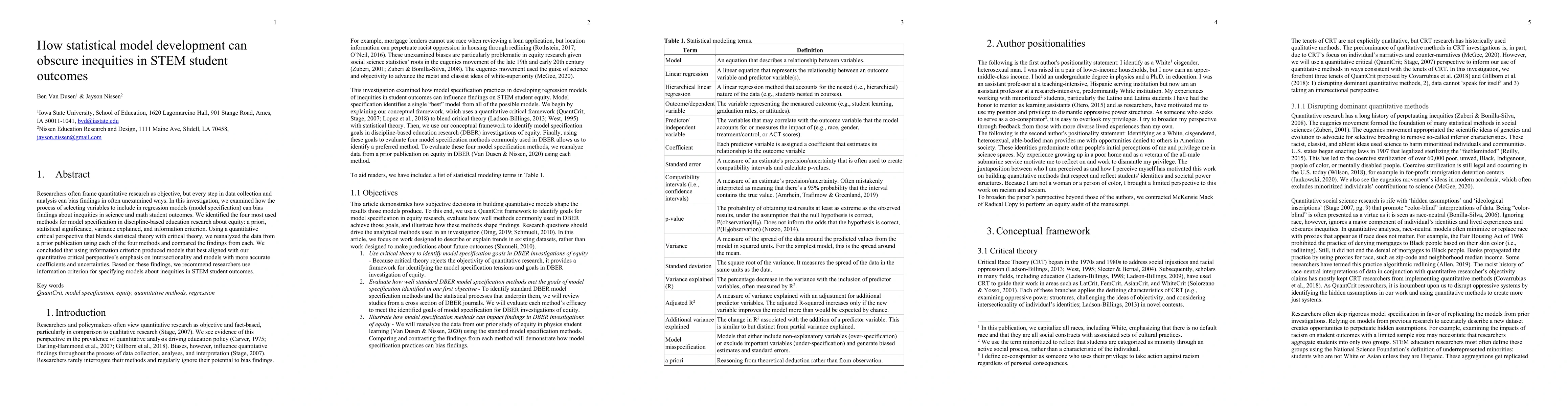 Researchers often frame quantitative research as objective, but every step in data collection and analysis can bias findings in often unexamined ways. In this investigation, we examined how the process of selecting variables to include in regression models (model specification) can bias findings about inequities in science and math student outcomes. We identified the four most used methods for model specification in discipline-based education research about equity: a priori, statistical significance, variance explained, and information criterion. Using a quantitative critical perspective that blends statistical theory with critical theory, we reanalyzed the data from a prior publication using each of the four methods and compared the findings from each. We concluded that using information criterion produced models that best aligned with our quantitative critical perspective's emphasis on intersectionality and models with more accurate coefficients and uncertainties. Based on these findings, we recommend researchers use information criterion for specifying models about inequities in STEM student outcomes.