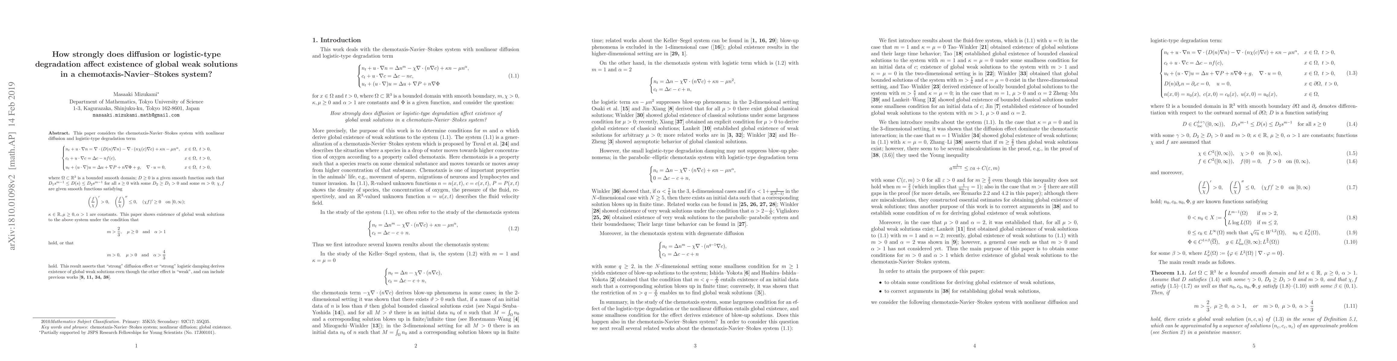 This paper considers the chemotaxis-Navier--Stokes system with nonlinear diffusion and logistic-type degradation term \begin{align*} \begin{cases} n_t + u\cdot\nabla n = \nabla \cdot(D(n)\nabla n) - \nabla\cdot(n \chi(c) \nabla c) + \kappa n - \mu n^\alpha, & x\in \Omega,\ t>0, \\ c_t + u\cdot\nabla c = \Delta c - nf(c), & x \in \Omega,\ t>0, \\ u_t + (u\cdot\nabla)u = \Delta u + \nabla P + n\nabla\Phi + g, \ \nabla\cdot u = 0, & x \in \Omega,\ t>0, \end{cases} \end{align*} where $\Omega\subset \mathbb{R}^3$ is a bounded smooth domain; $D \ge 0$ is a given smooth function such that $D_1 s^{m-1} \le D(s) \le D_2 s^{m-1}$ for all $s\ge 0$ with some $D_2 \ge D_1 > 0$ and some $m > 0$; $\chi,f$ are given functions satisfying some conditions; $\kappa \in \mathbb{R},\mu \ge0,\alpha>1$ are constants. This paper shows existence of global weak solutions to the above system under the condition that \begin{align*} m >\frac{2}{3},\quad \mu \ge 0 \quad \mbox{and}\quad \alpha >1 \end{align*} hold, or that \begin{align*} m> 0, \quad \mu>0 \quad \mbox{and} \quad \alpha > \frac{4}{3} \end{align*} hold. This result asserts that `strong' diffusion effect or `strong' logistic damping derives existence of global weak solutions even though the other effect is `weak', and can include previous works.
