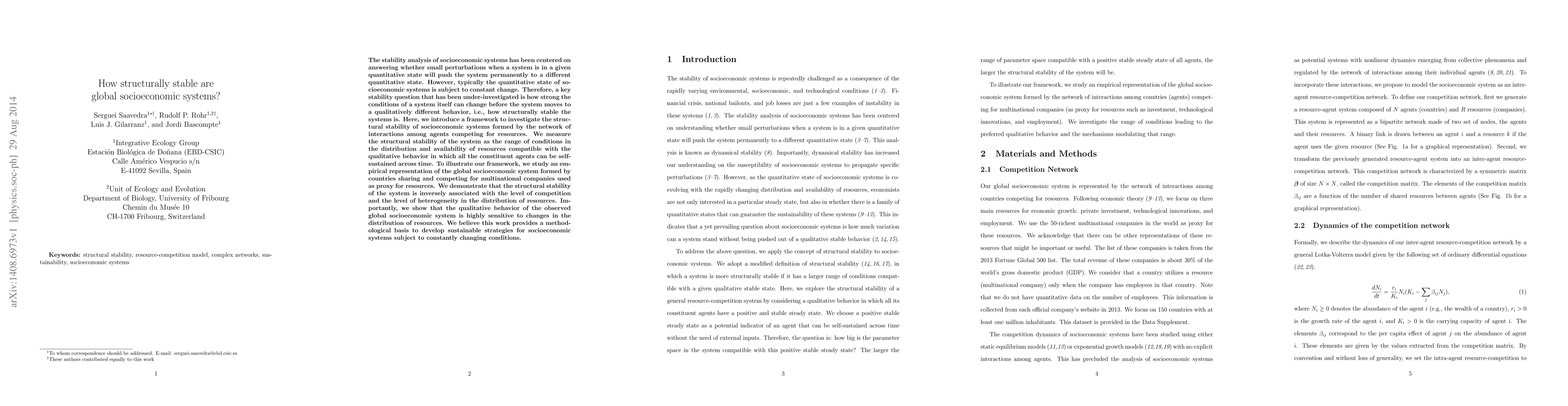This paper introduces a framework for analyzing the structural stability of global socioeconomic systems, focusing on how changes in resource distribution and competition affect qualitative behavior. It finds that higher competition and resource heterogeneity reduce structural stability, suggesting the need for sustainable strategies.