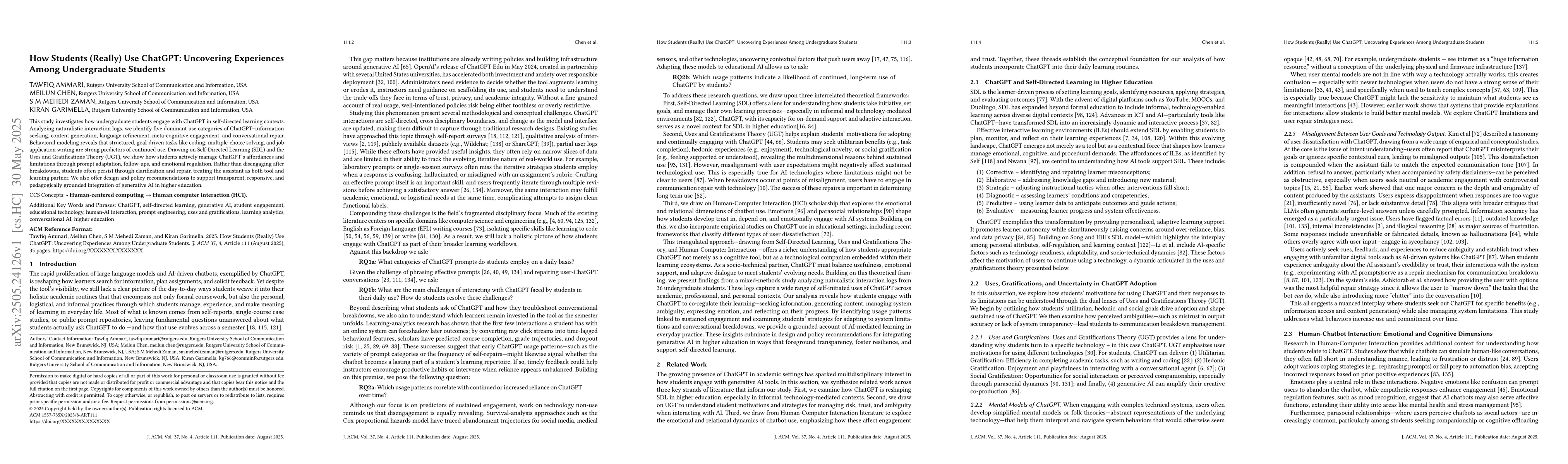 Undergraduate students use ChatGPT in self-directed learning for specific tasks like coding and writing, managing its affordances and limitations through adaptation and emotional regulation. Structured tasks predict continued use, and the tool is treated as both a learning partner and a source of clarification.