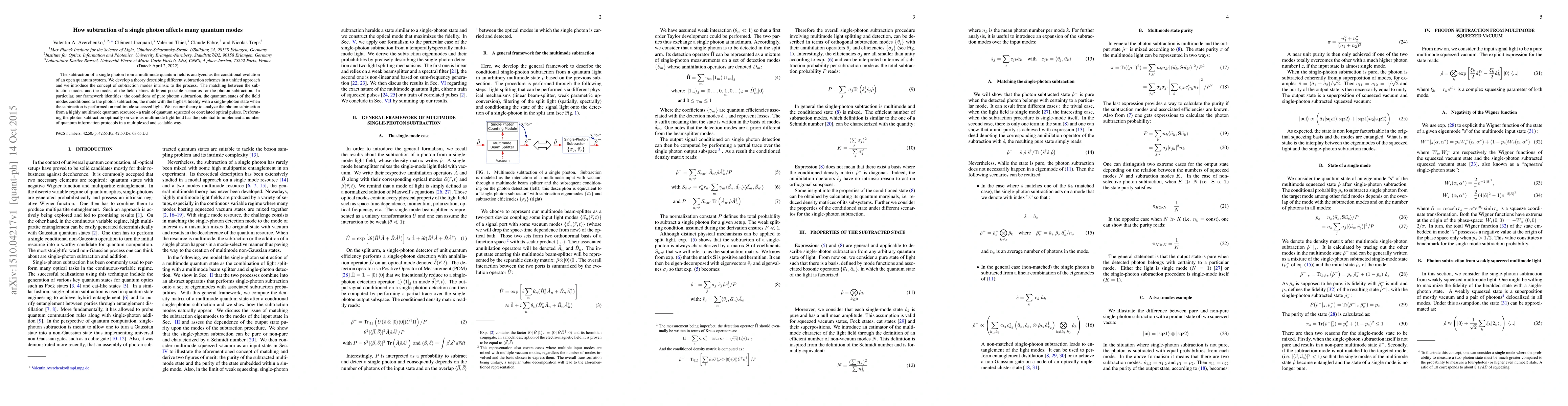 The subtraction of a single photon from a multimode quantum field is analyzed as the conditional evolution of an open quantum system. We develop a theory describing different subtraction schemes in a unified approach and we introduce the concept of subtraction modes intrinsic to the process. The matching between the subtraction modes and the modes of the field defines different possible scenarios for the photon subtraction. In particular, our framework identifies: the conditions of pure photon subtraction, the quantum states of the field modes conditioned to the photon subtraction, the mode with the highest fidelity with a single-photon state when the subtraction is performed on multimode squeezed light. We use our theory to analyze the photon subtraction from a highly multimode quantum resource - a train of quantum squeezed or correlated optical pulses. Performing the photon subtraction optimally on various multimode light field has the potential to implement a number of quantum information protocols in a multiplexed and scalable way.