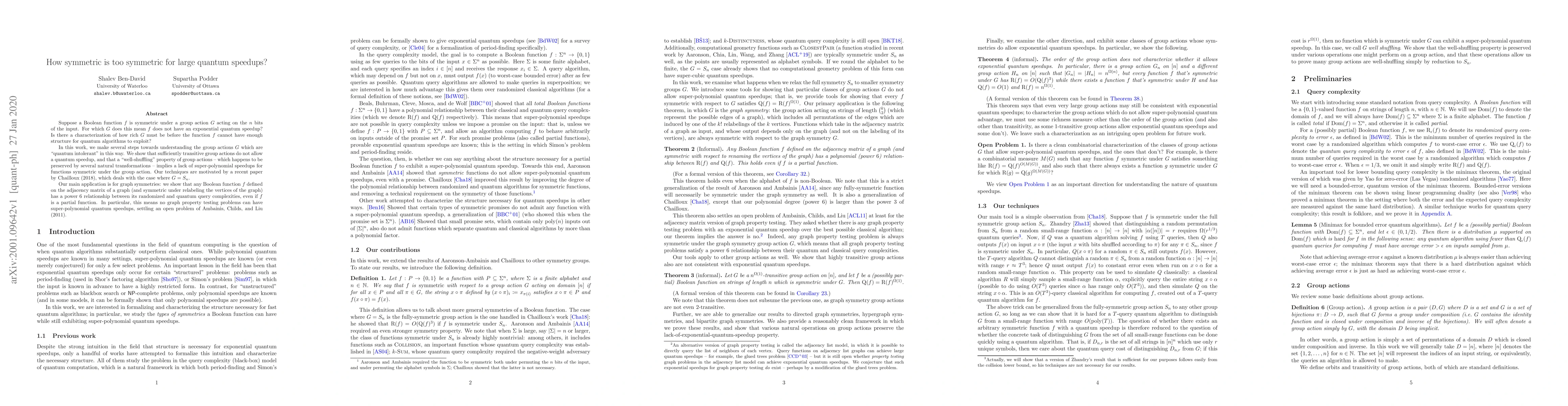 This paper explores the limits of quantum speedups for Boolean functions symmetric under certain group actions, demonstrating that sufficiently transitive and well-shuffling group actions inhibit quantum advantages. It concludes that no graph property testing problems can achieve super-polynomial quantum speedups.
