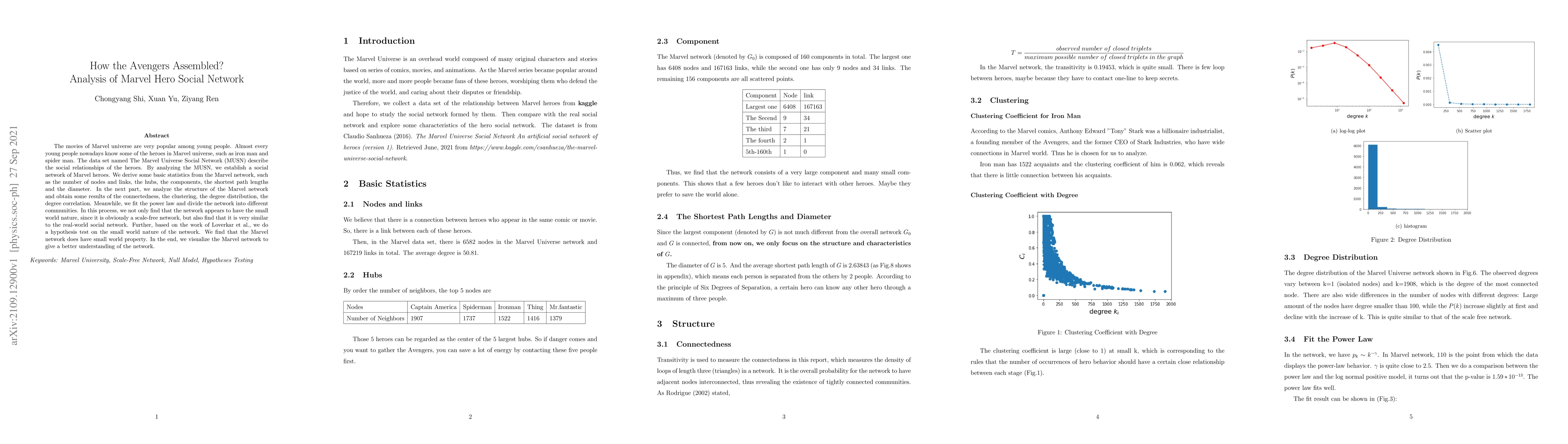 The movies of Marvel universe are very popular among young people. Almost every young people nowadays know some of the heroes in Marvel universe, such as iron man and spider man. The data set named The Marvel Universe Social Network (MUSN) describe the social relationships of the heroes. By analyzing the MUSN, we establish a social network of Marvel heroes. We derive some basic statistics from the Marvel network, such as the number of nodes and links, the hubs, the components, the shortest path lengths and the diameter. In the next part, we analyze the structure of the Marvel network and obtain some results of the connectedness, the clustering, the degree distribution, the degree correlation. Meanwhile, we fit the power law and divide the network into different communities. In this process, we not only find that the network appears to have the small world nature, since it is obviously a scale-free network, but also find that it is very similar to the real-world social network. Further, based on the work of Loverkar et al., we do a hypothesis test on the small world nature of the network. We find that the Marvel network does have small world property. In the end, we visualize the Marvel network to give a better understanding of the network.