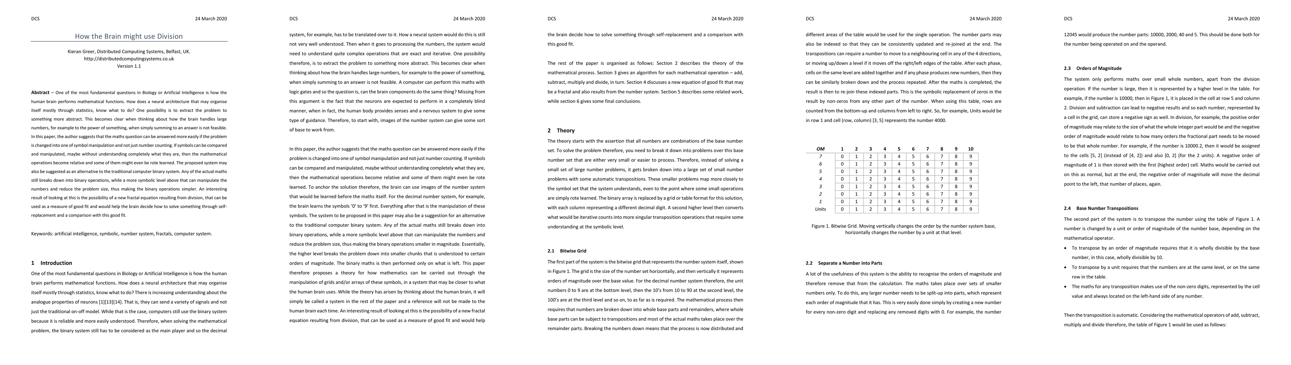 One of the most fundamental questions in Biology or Artificial Intelligence is how the human brain performs mathematical functions. How does a neural architecture that may organise itself mostly through statistics, know what to do? One possibility is to extract the problem to something more abstract. This becomes clear when thinking about how the brain handles large numbers, for example to the power of something, when simply summing to an answer is not feasible. In this paper, the author suggests that the maths question can be answered more easily if the problem is changed into one of symbol manipulation and not just number counting. If symbols can be compared and manipulated, maybe without understanding completely what they are, then the mathematical operations become relative and some of them might even be rote learned. The proposed system may also be suggested as an alternative to the traditional computer binary system. Any of the actual maths still breaks down into binary operations, while a more symbolic level above that can manipulate the numbers and reduce the problem size, thus making the binary operations simpler. An interesting result of looking at this is the possibility of a new fractal equation resulting from division, that can be used as a measure of good fit and would help the brain decide how to solve something through self-replacement and a comparison with this good fit.