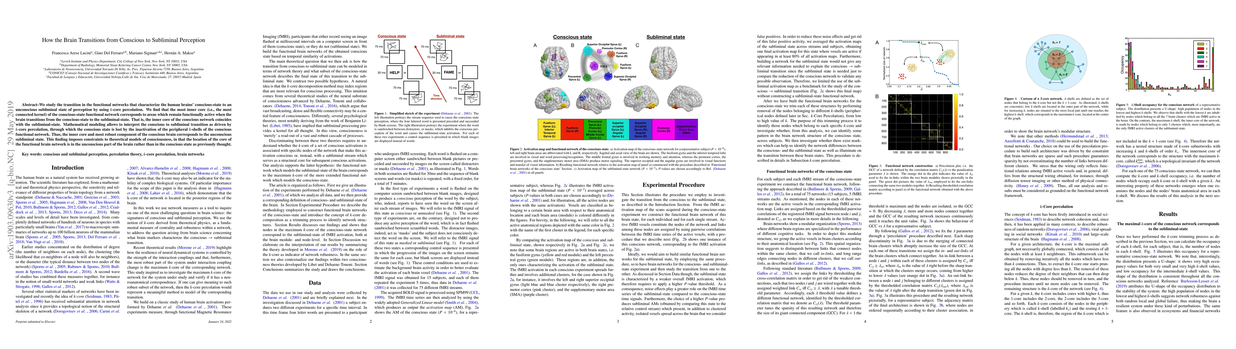 We study the transition in the functional networks that characterize the human brains' conscious-state to an unconscious subliminal state of perception by using k-core percolation. We find that the most inner core (i.e., the most connected kernel) of the conscious-state functional network corresponds to areas which remain functionally active when the brain transitions from the conscious-state to the subliminal-state. That is, the inner core of the conscious network coincides with the subliminal-state. Mathematical modeling allows to interpret the conscious to subliminal transition as driven by k-core percolation, through which the conscious state is lost by the inactivation of the peripheral k-shells of the conscious functional network. Thus, the inner core and most robust component of the conscious brain corresponds to the unconscious subliminal state. This finding imposes constraints to theoretical models of consciousness, in that the location of the core of the functional brain network is in the unconscious part of the brain rather than in the conscious state as previously thought.