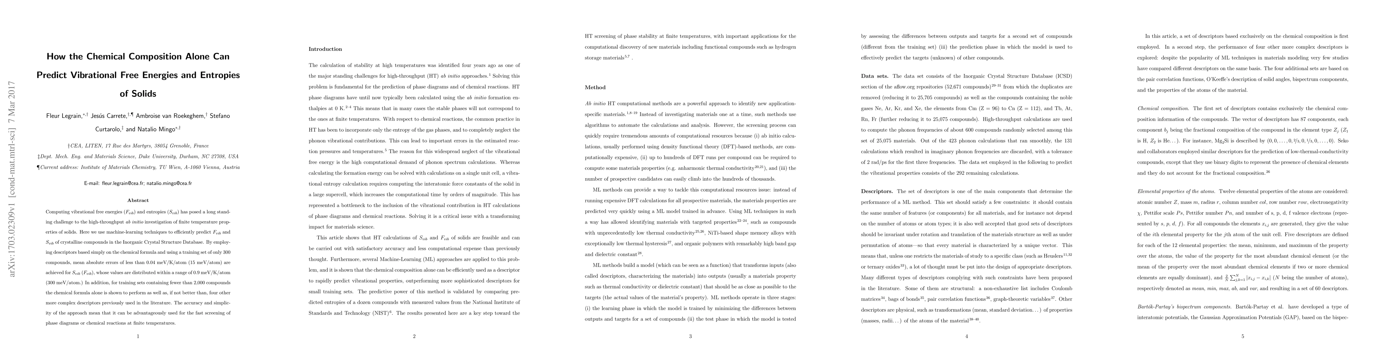 Computing vibrational free energies ($F_{vib}$) and entropies ($S_{vib}$) has posed a long standing challenge to the high-throughput ab initio investigation of finite temperature properties of solids. Here we use machine-learning techniques to efficiently predict $F_{vib}$ and $S_{vib}$ of crystalline compounds in the Inorganic Crystal Structure Database. By employing descriptors based simply on the chemical formula and using a training set of only 300 compounds, mean absolute errors of less than 0.04 meV/K/atom (15 meV/atom) are achieved for $S_{vib}$ ($F_{vib}$), whose values are distributed within a range of 0.9 meV/K/atom (300 meV/atom.) In addition, for training sets containing fewer than 2,000 compounds the chemical formula alone is shown to perform as well as, if not better than, four other more complex descriptors previously used in the literature. The accuracy and simplicity of the approach mean that it can be advantageously used for the fast screening of phase diagrams or chemical reactions at finite temperatures.