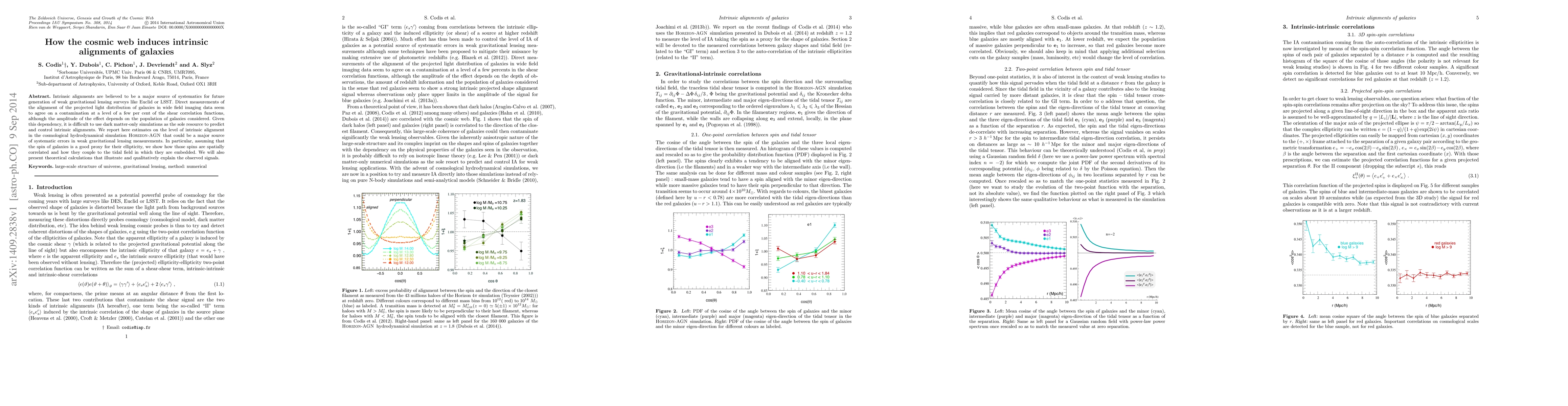 This paper investigates the intrinsic alignments of galaxies within the cosmic web, attributing them to systematic errors in weak gravitational lensing surveys. It uses the cosmological hydrodynamical simulation Horizon-AGN to demonstrate how galaxy spins correlate spatially and align with the tidal field, providing theoretical insights into these alignments.