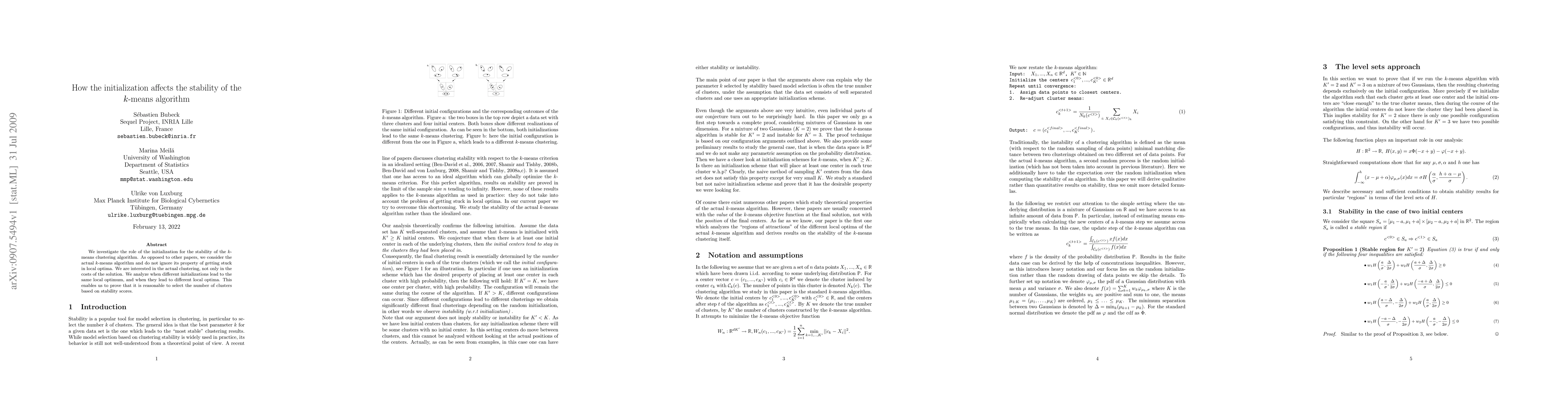 This paper examines how different initializations impact the stability of the k-means clustering algorithm, focusing on the algorithm's tendency to get stuck in local optima. It concludes that the choice of initialization affects whether different runs converge to the same or different local optima, supporting the idea of selecting the number of clusters based on stability scores.