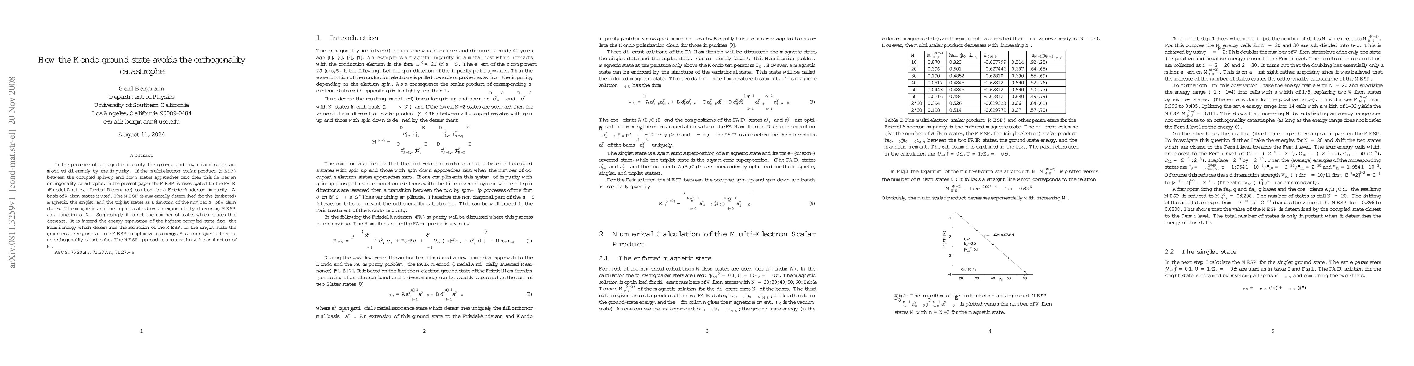 This paper investigates the avoidance of the orthogonality catastrophe in the Kondo ground state by analyzing the multi-electron scalar product (MESP) for the FAIR solution of a Friedel-Anderson impurity. The MESP decreases exponentially in magnetic and triplet states due to energy separation from the Fermi level, while the singlet state maintains a finite MESP, thus avoiding the catastrophe.