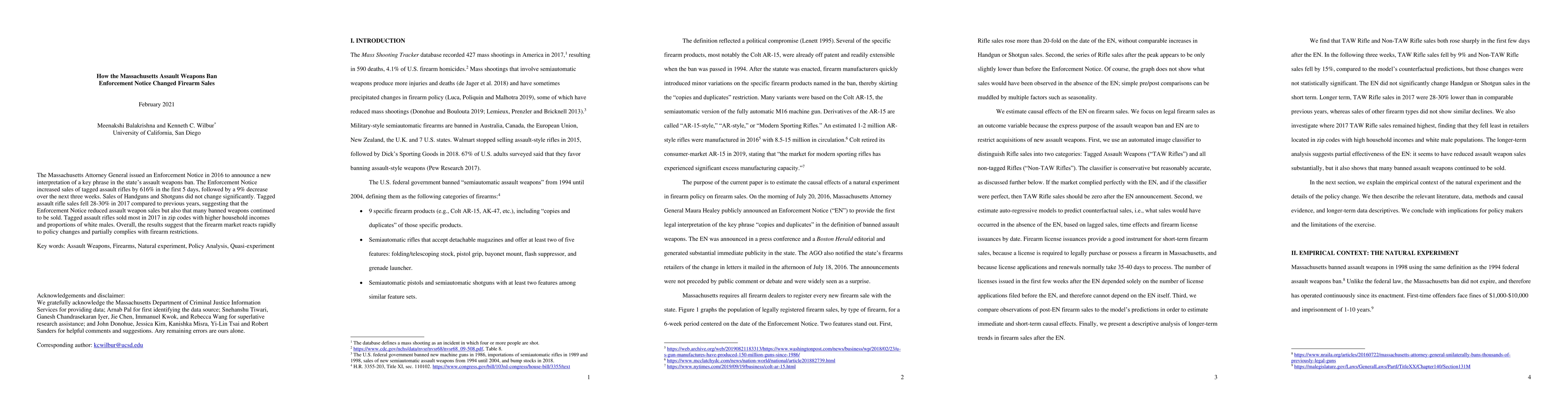 The Massachusetts Attorney General issued an Enforcement Notice in 2016 to announce a new interpretation of a key phrase in the state's assault weapons ban. The Enforcement Notice increased sales of tagged assault rifles by 616% in the first 5 days, followed by a 9% decrease over the next three weeks. Sales of Handguns and Shotguns did not change significantly. Tagged assault rifle sales fell 28-30% in 2017 compared to previous years, suggesting that the Enforcement Notice reduced assault weapon sales but also that many banned weapons continued to be sold. Tagged assault rifles sold most in 2017 in zip codes with higher household incomes and proportions of white males. Overall, the results suggest that the firearm market reacts rapidly to policy changes and partially complies with firearm restrictions.