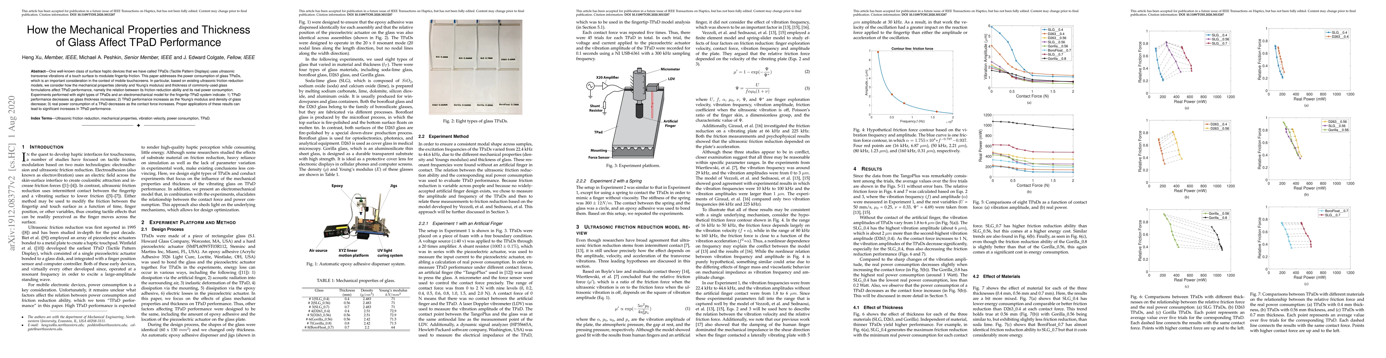 Glass thickness decreases TPaD performance while glass density and Young's modulus have the opposite effect, with lower values increasing performance, according to a study on power consumption of ultrasonic friction reduction devices.