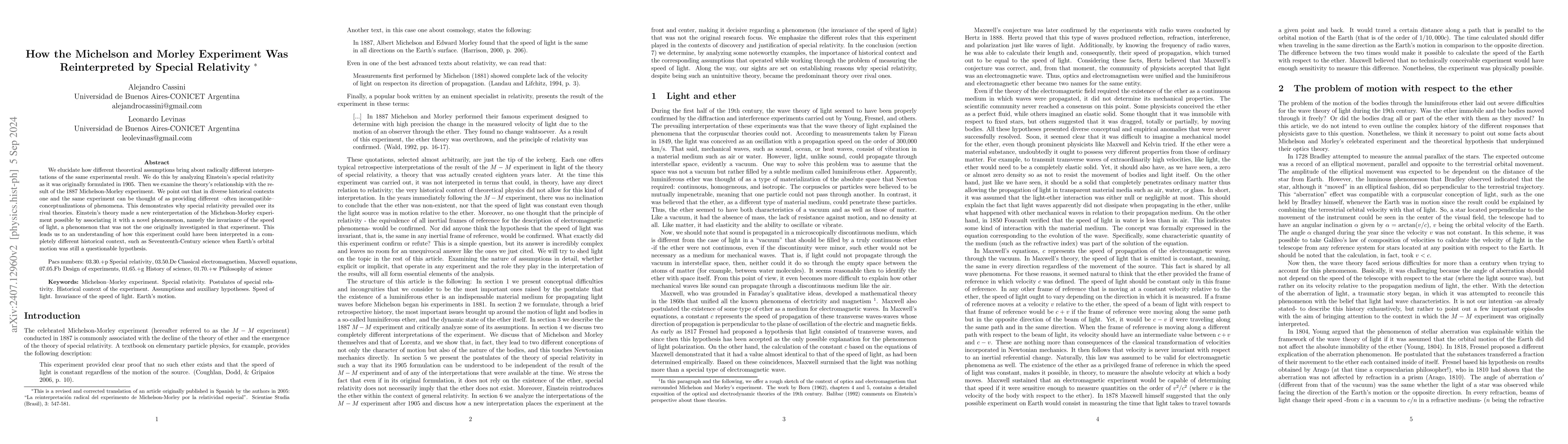 The paper explores how special relativity reinterpreted the Michelson and Morley experiment, emphasizing that varying theoretical assumptions lead to different interpretations of the same result. Special relativity's success is attributed to its novel association of the experiment with the invariance of the speed of light, a phenomenon not originally investigated.