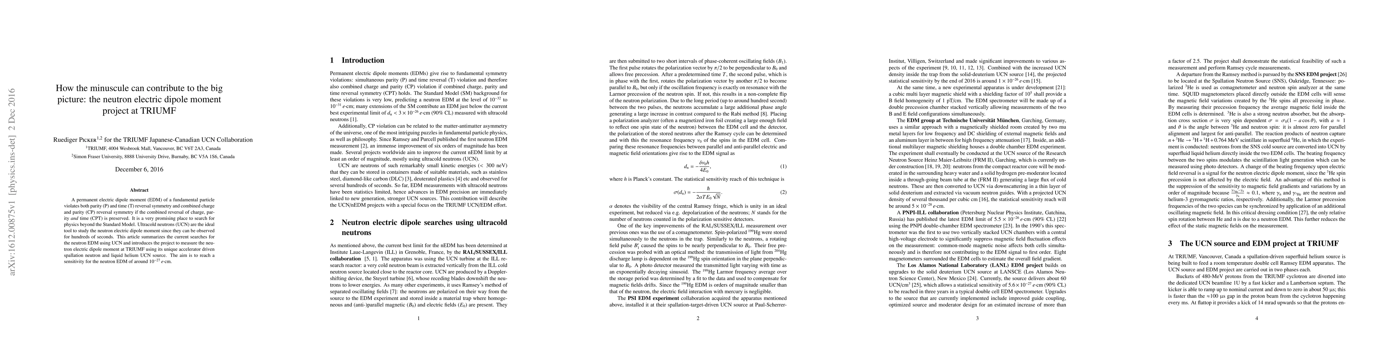 This paper discusses the search for the neutron electric dipole moment (EDM), a fundamental particle property that could reveal physics beyond the Standard Model. The project at TRIUMF aims to measure the neutron EDM using ultracold neutrons, targeting a sensitivity of around $10^{-27} \,e \cdot$cm.