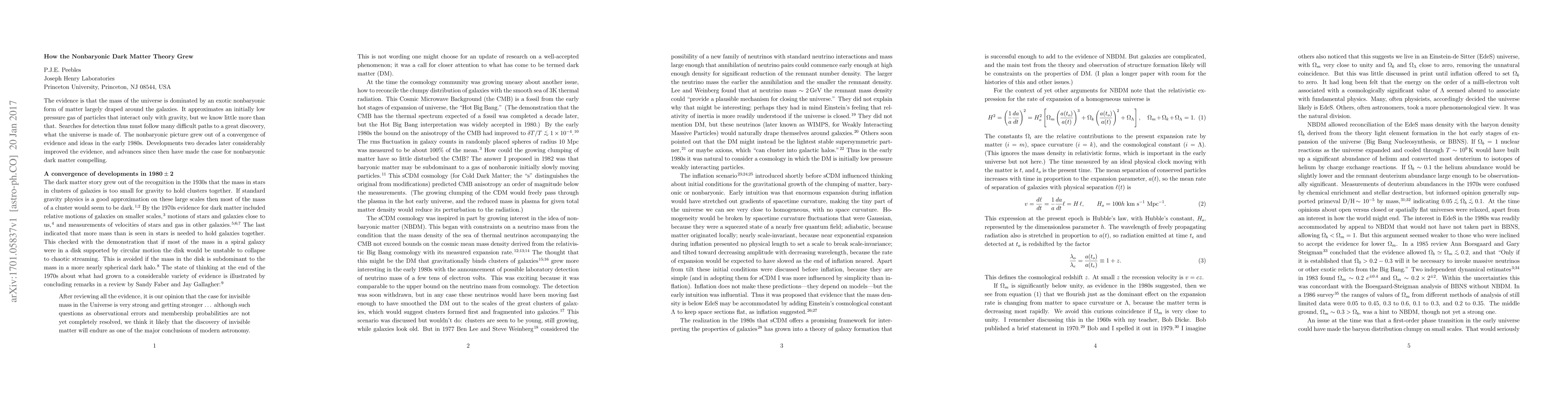 This paper discusses the evolution of the nonbaryonic dark matter theory, tracing its development from the early 1980s when evidence first suggested it dominated the universe's mass, to more recent advancements that have strengthened the case for its existence.