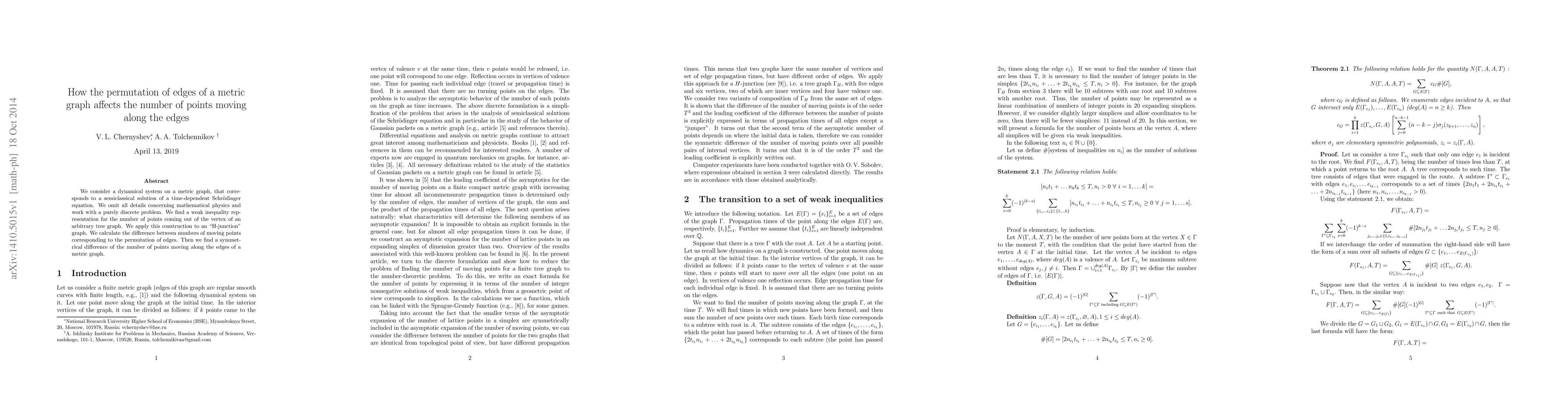 This paper presents a method to determine the number of points moving along edges of a metric graph, with a focus on tree graphs and H-junctions. It introduces a weak inequality representation and calculates the difference in point counts due to edge permutations, also finding a symmetrical difference for edge movements.
