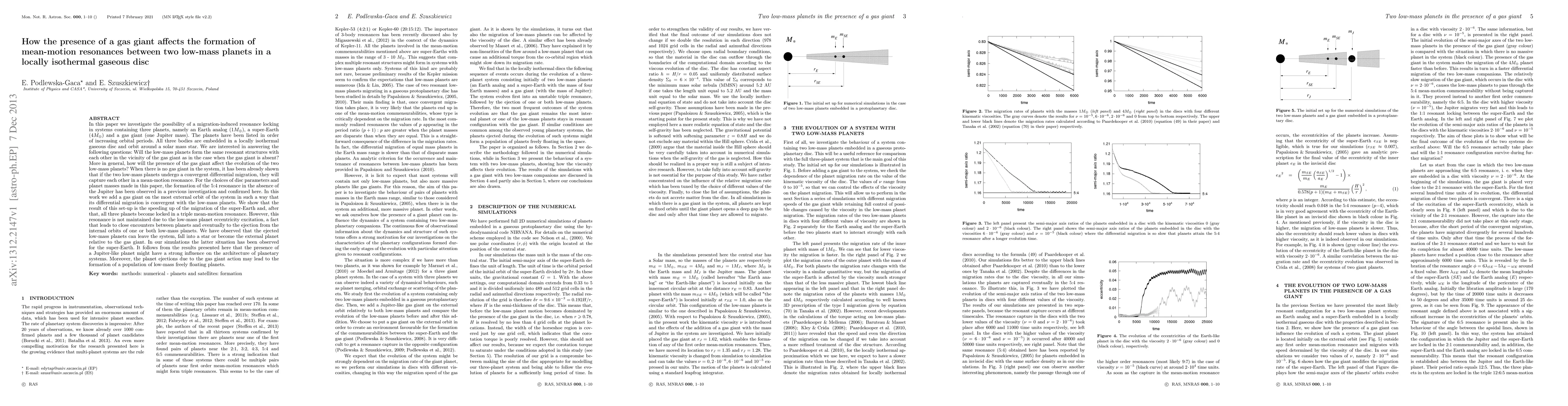 In this paper we investigate the possibility of a migration-induced resonance locking in systems containing three planets, namely an Earth analog, a super-Earth and a gas giant. The planets have been listed in order of increasing orbital periods. All three bodies are embedded in a locally isothermal gaseous disc and orbit around a solar mass star. We are interested in answering the following question: Will the low-mass planets form the same resonant structures with each other in the vicinity of the gas giant as in the case when the gas giant is absent? When there is no gas giant in the system, it has been already shown that if the two low-mass planets undergo a convergent differential migration, they will capture each other in a mean-motion resonance. For the choices of disc parameters and planet masses made in this paper, the formation of the 5:4 resonance in the absence of the Jupiter has been observed. In this work we add a gas giant on the most external orbit of the system in such a way that its differential migration is convergent with the low-mass planets. We show that the result of this set-up is the speeding up of the migration of the super-Earth and, after that, all three planets become locked in a triple mean-motion resonance. However, this resonance is not maintained due to the low-mass planet eccentricity excitation, a fact that leads to close encounters between planets and eventually to the ejection from the internal orbits of one or both low-mass planets.