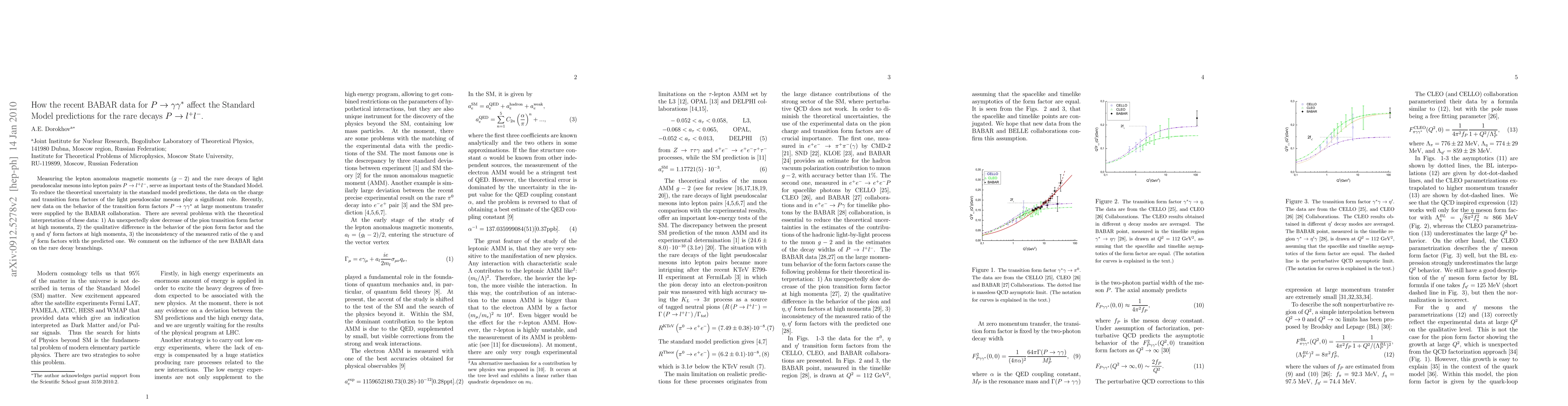 Measuring the lepton anomalous magnetic moments $(g-2)$ and the rare decays of light pseudoscalar mesons into lepton pairs $P\to l^{+}l^{-} $, serve as important tests of the Standard Model. To reduce the theoretical uncertainty in the standard model predictions, the data on the charge and transition form factors of the light pseudoscalar mesons play a significant role. Recently, new data on the behavior of the transition form factors $P\to\gamma\gamma* $ at large momentum transfer were supplied by the BABAR collaboration. There are several problems with the theoretical interpretation of these data: 1) An unexpectedly slow decrease of the pion transition form factor at high momenta, 2) the qualitative difference in the behavior of the pion form factor and the $\eta$ and $\eta^\prime$ form factors at high momenta, 3) the inconsistency of the measured ratio of the $\eta$ and $\eta^\prime$ form factors with the predicted one. We comment on the influence of the new BABAR data on the rare decay branchings.