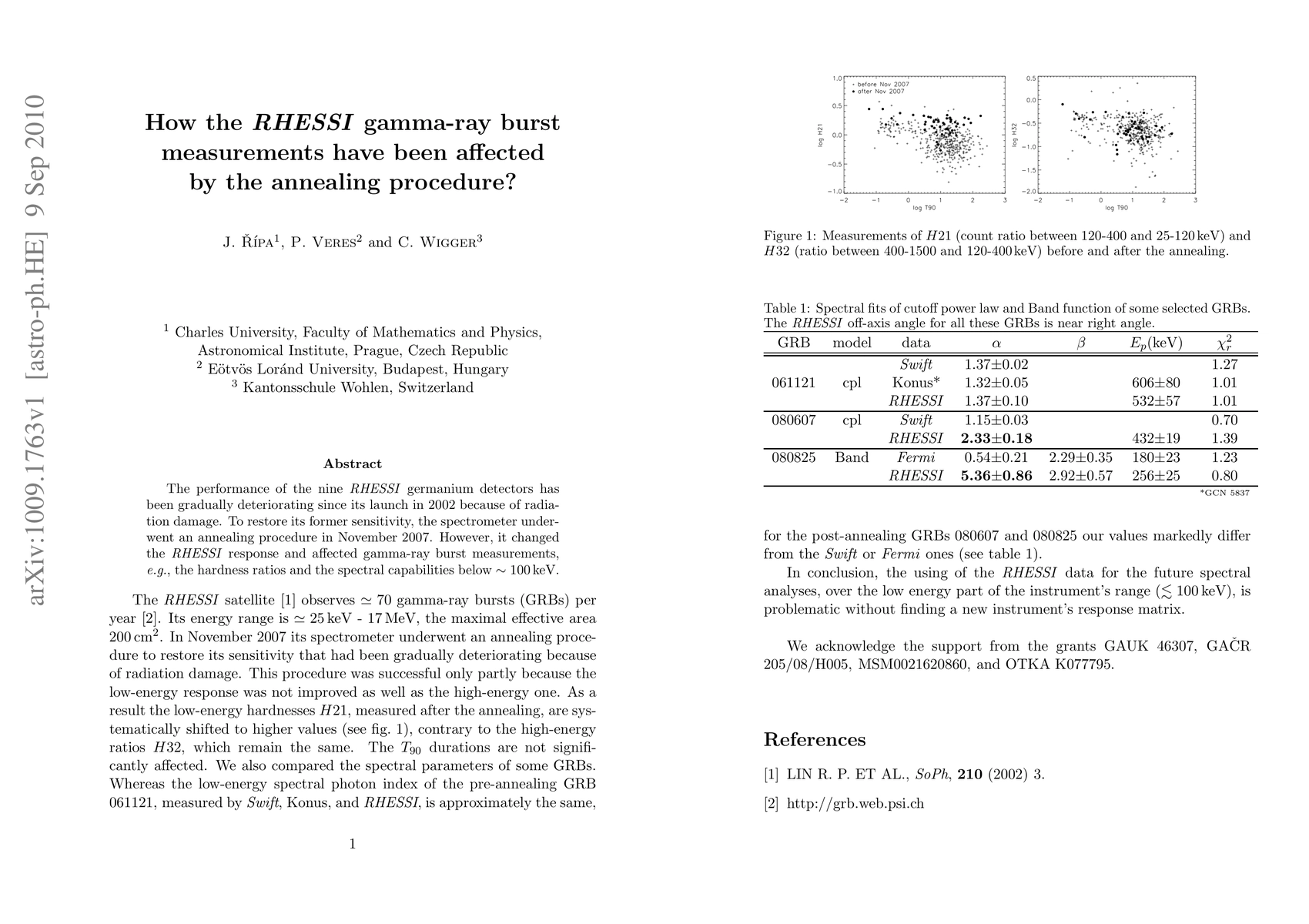 The performance of the nine RHESSI germanium detectors has been gradually deteriorating since its launch in 2002 because of radiation damage. To restore its former sensitivity, the spectrometer underwent an annealing procedure in November 2007. However, it changed the RHESSI response and affected gamma-ray burst measurements, e.g., the hardness ratios and the spectral capabilities below ~100keV.