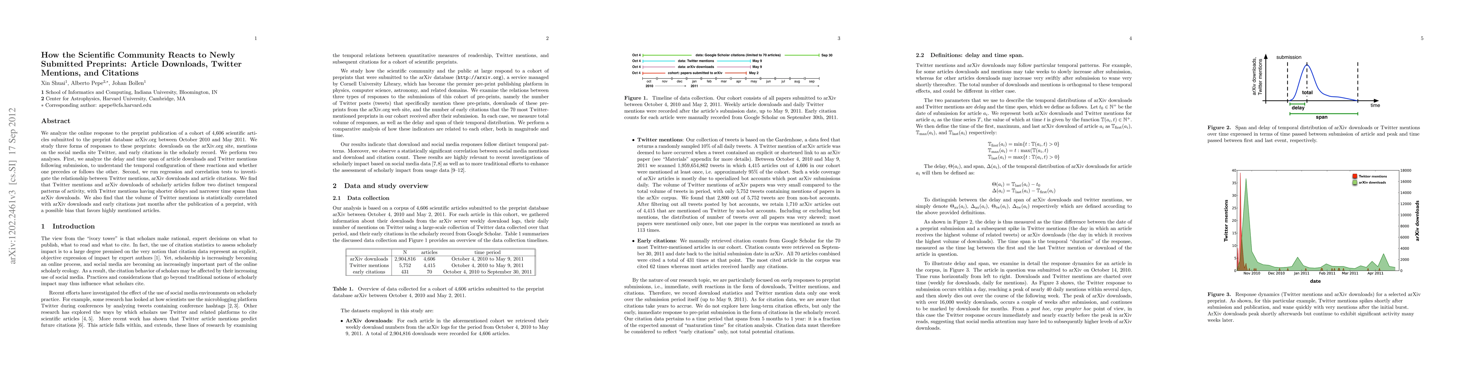 We analyze the online response to the preprint publication of a cohort of 4,606 scientific articles submitted to the preprint database arXiv.org between October 2010 and May 2011. We study three forms of responses to these preprints: downloads on the arXiv.org site, mentions on the social media site Twitter, and early citations in the scholarly record. We perform two analyses. First, we analyze the delay and time span of article downloads and Twitter mentions following submission, to understand the temporal configuration of these reactions and whether one precedes or follows the other. Second, we run regression and correlation tests to investigate the relationship between Twitter mentions, arXiv downloads and article citations. We find that Twitter mentions and arXiv downloads of scholarly articles follow two distinct temporal patterns of activity, with Twitter mentions having shorter delays and narrower time spans than arXiv downloads. We also find that the volume of Twitter mentions is statistically correlated with arXiv downloads and early citations just months after the publication of a preprint, with a possible bias that favors highly mentioned articles.