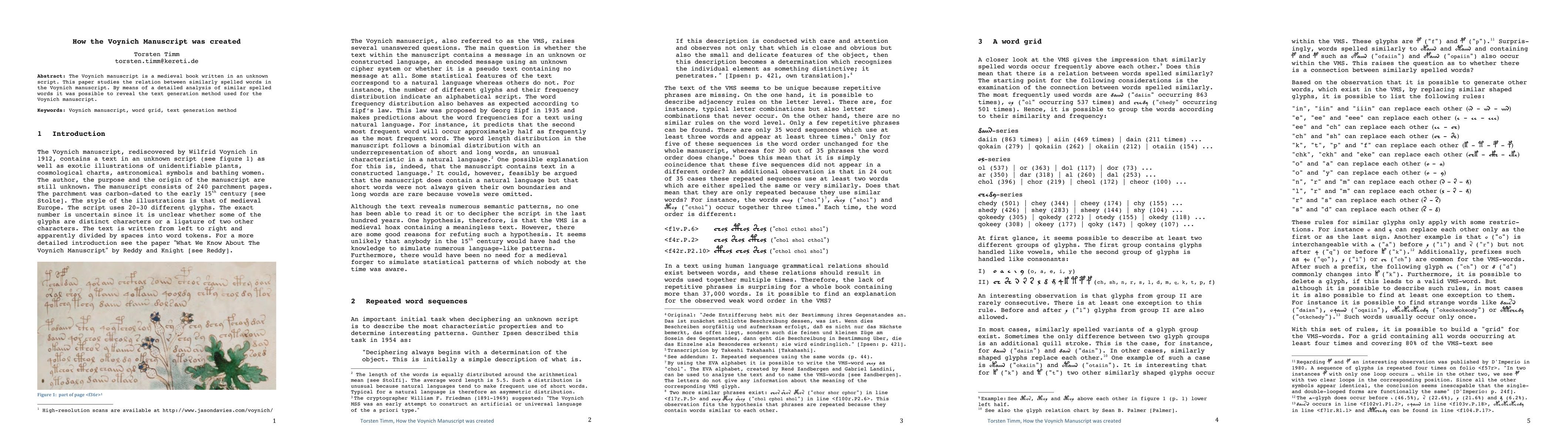 Summary: This paper investigates the Voynich manuscript's unknown script by analyzing similarly spelled words, revealing the text generation method used in its creation. The findings provide insight into the manuscript's composition and potential meaning.