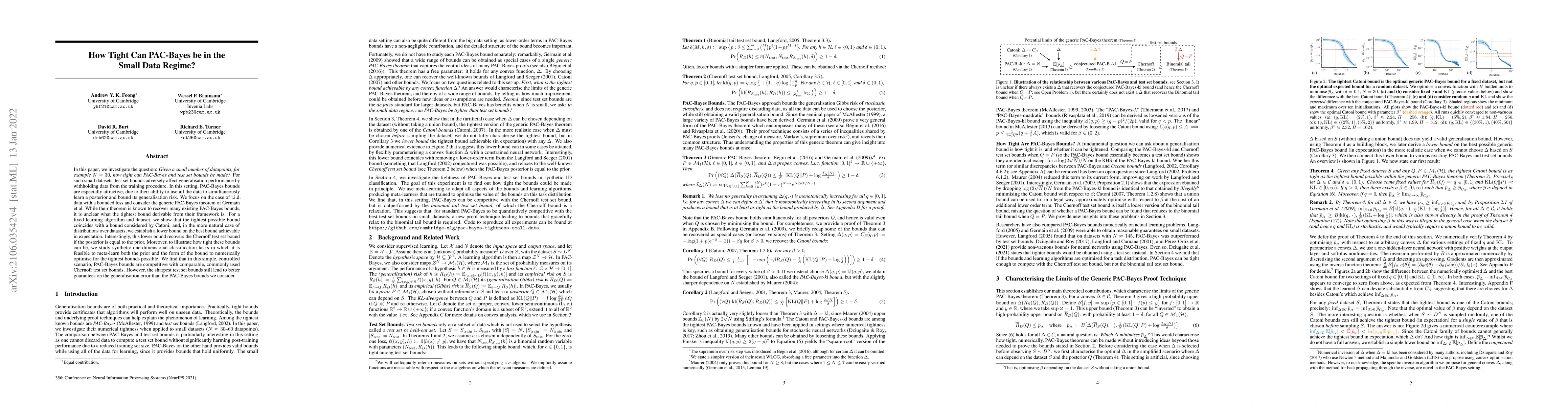 This paper explores the tightness of PAC-Bayes bounds in small data scenarios, demonstrating that they can be competitive with Chernoff test set bounds when meta-learning is applied. It establishes that the tightest PAC-Bayes bound coincides with Catoni's bound and provides a lower bound on the best achievable bound, showing its effectiveness in controlled synthetic tasks.