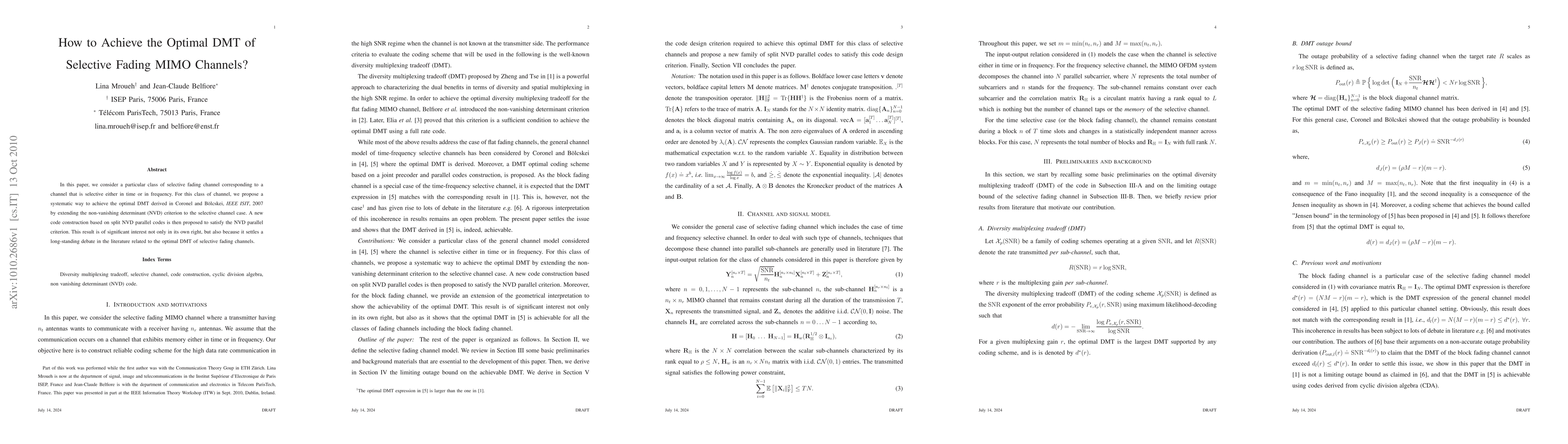 This paper proposes a method to achieve the optimal diversity-multiplexing trade-off (DMT) for selective fading MIMO channels by extending the non-vanishing determinant criterion to these channels. It introduces a new code construction based on split NVD parallel codes, settling a long-standing debate on the optimal DMT for such channels.
