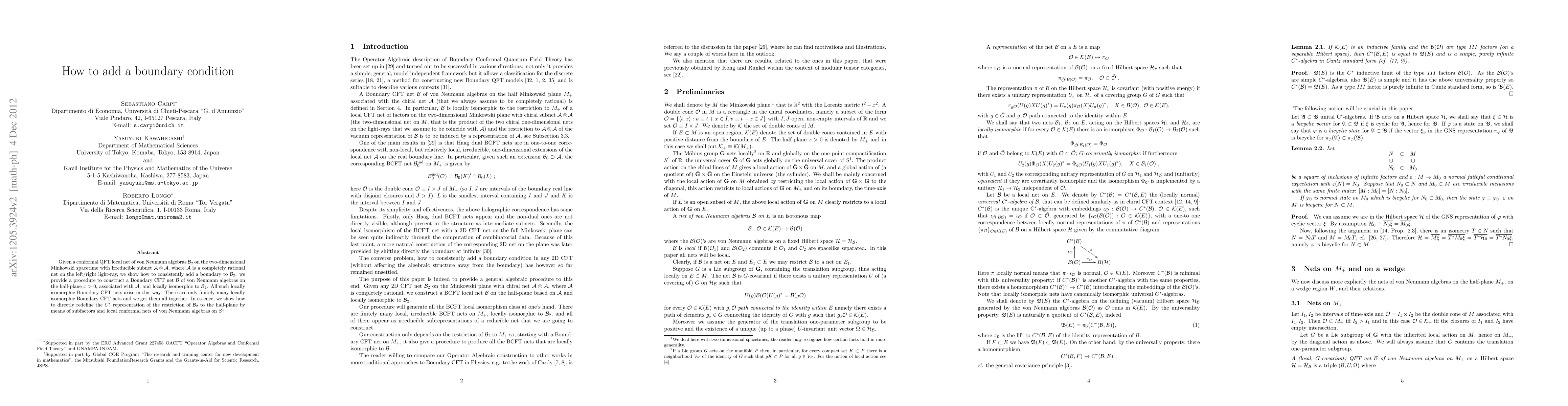 Researchers show how to add a boundary condition to a conformal quantum field theory (QFT), creating a new local net of von Neumann algebras associated with the original network, which includes all possible locally isomorphic networks.
