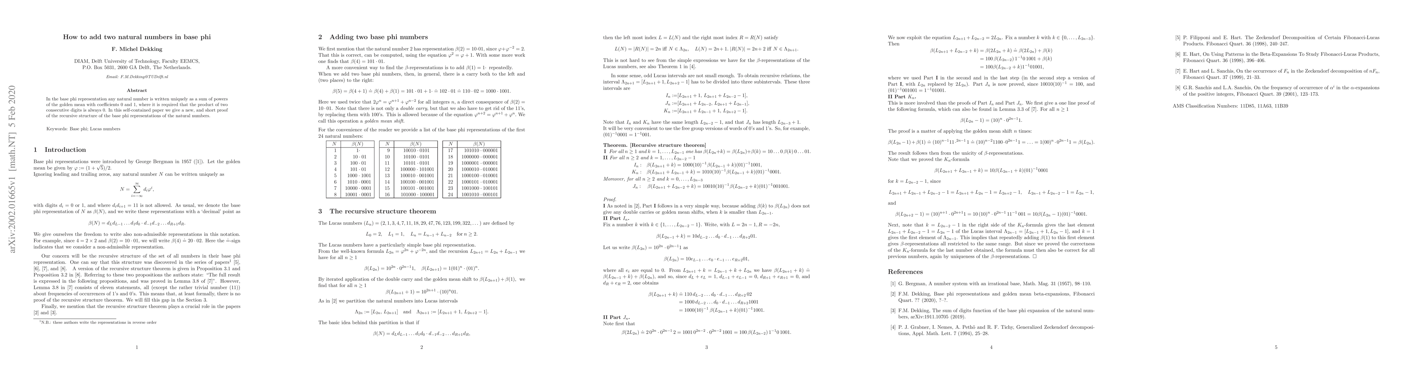 This paper presents a concise proof for the recursive structure of natural numbers represented in base phi, where numbers are expressed as sums of powers of the golden mean with binary coefficients, ensuring no product of consecutive digits is non-zero. The method highlights the unique properties of this numeral system.