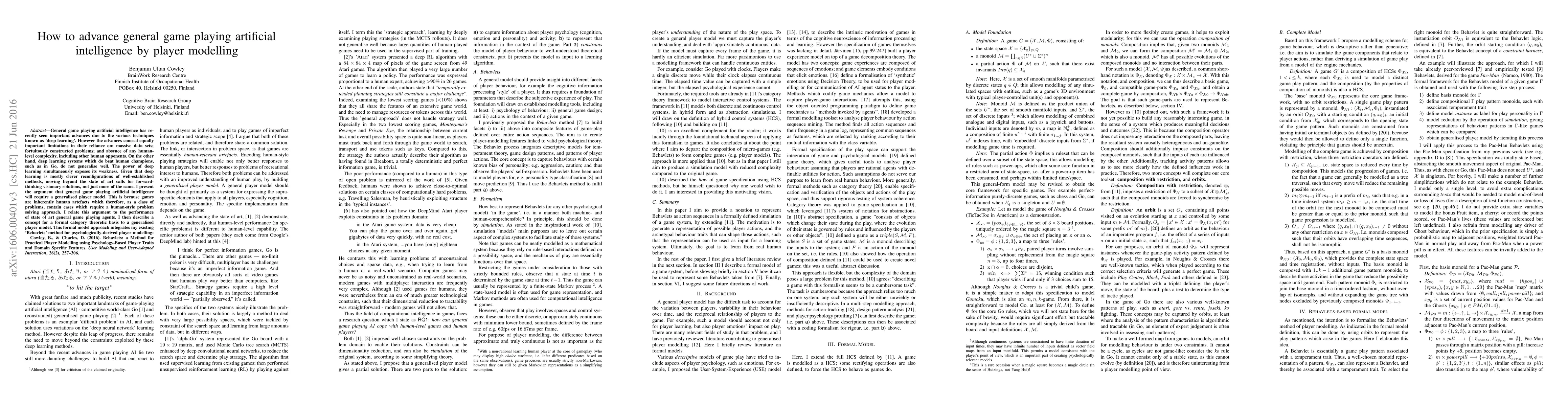 This paper argues that advancing general game playing AI requires integrating human-style problem solving, achieved through a generalized player model. It proposes a formal category theoretic basis for this approach, combining the existing 'Behavlets' method for psychologically-derived player modelling to enhance AI's generalization beyond current deep learning techniques.