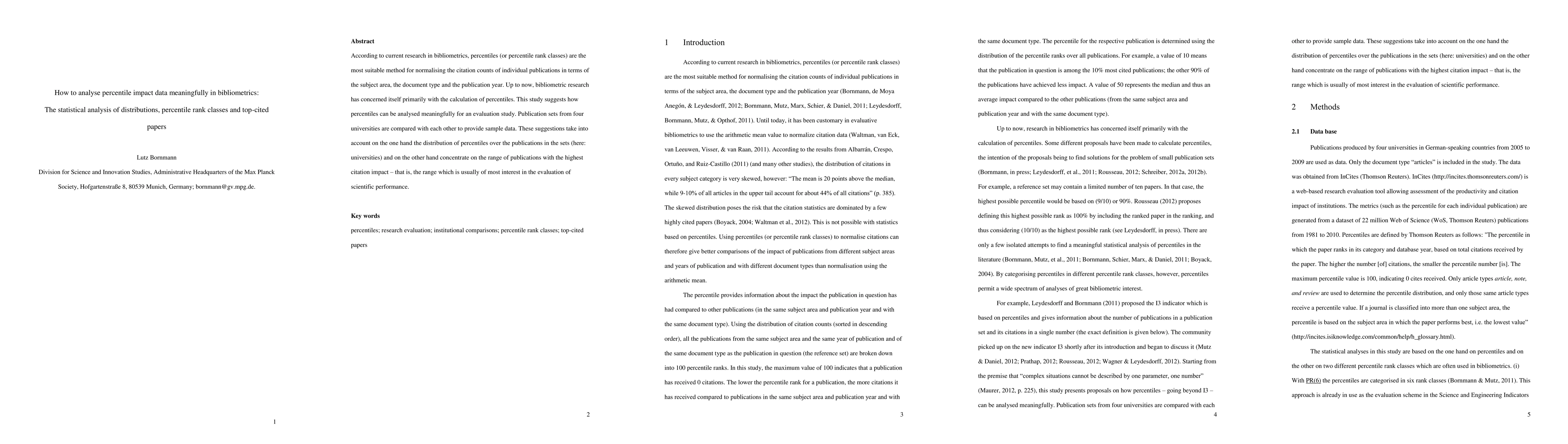 This study proposes methods for meaningfully analyzing percentile impact data in bibliometrics, focusing on the distribution of percentiles across publications and the top-cited papers, using publication sets from four universities as sample data. The aim is to evaluate scientific performance more effectively.