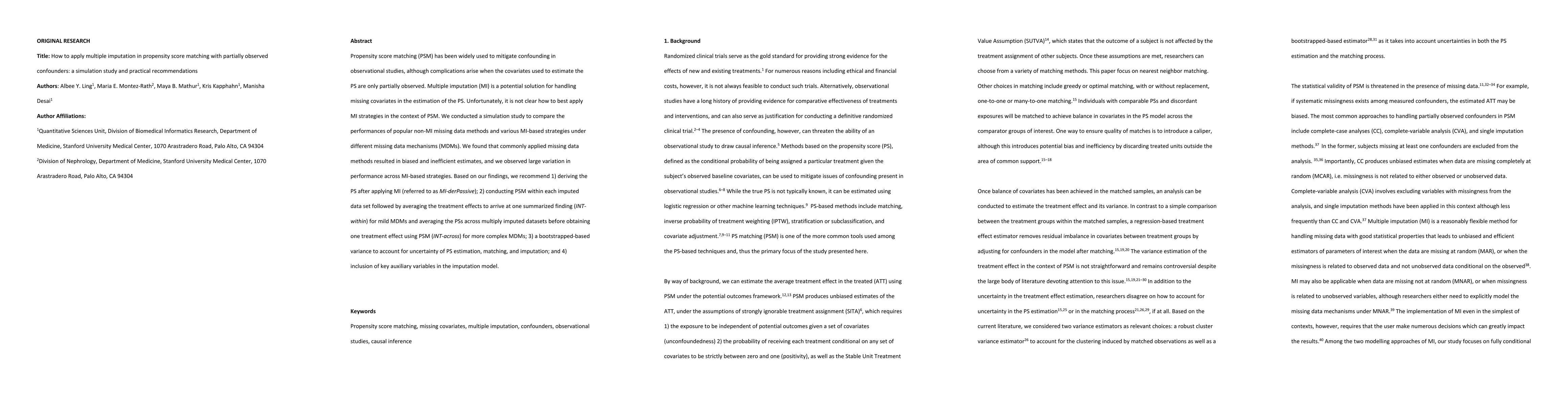 This paper investigates the application of multiple imputation (MI) in propensity score matching (PSM) for partially observed confounders through a simulation study. It recommends MI-derPassive, INT-within, and INT-across strategies, along with bootstrapped variance and auxiliary variables inclusion for improved handling of missing data.