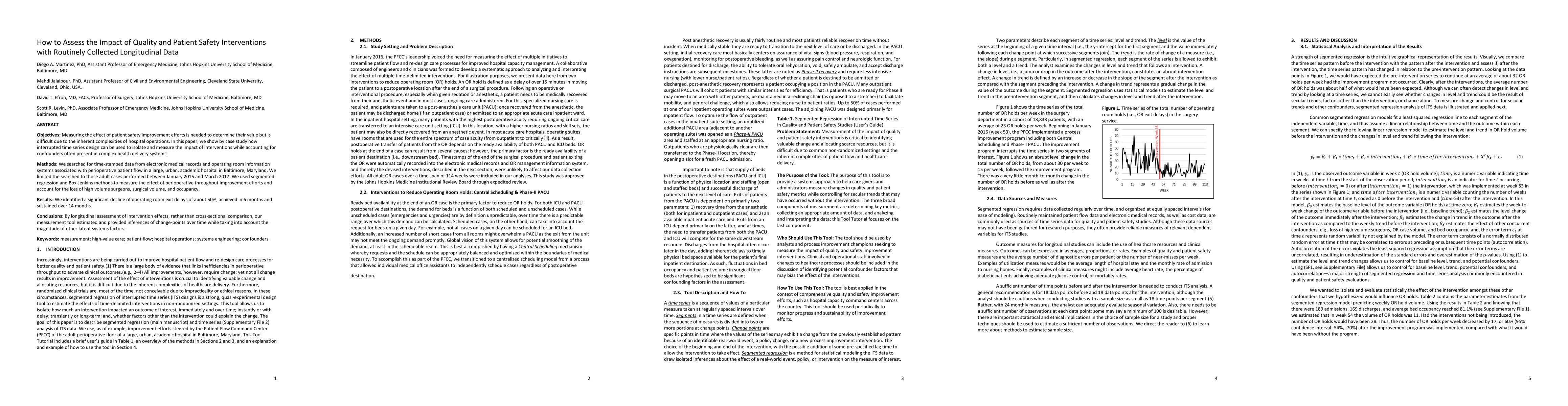Measuring the effect of patient safety improvement efforts is needed to determine their value but is difficult due to the inherent complexities of hospital operations. In this paper, we show by case study how interrupted time series design can be used to isolate and measure the impact of interventions while accounting for confounders often present in complex health delivery systems. We searched for time-stamped data from electronic medical records and operating room information systems associated with perioperative patient flow in a large, urban, academic hospital in Baltimore, Maryland. We limited the searched to those adult cases performed between January 2015 and March 2017. We used segmented regression and Box-Jenkins methods to measure the effect of perioperative throughput improvement efforts and account for the loss of high volume surgeons, surgical volume, and occupancy. We identified a significant decline of operating room exit delays of about 50%, achieved in 6 months and sustained over 14 months. By longitudinal assessment of intervention effects, rather than cross-sectional comparison, our measurement tool estimated and provided inferences of change-points over time while taking into account the magnitude of other latent systems factors.