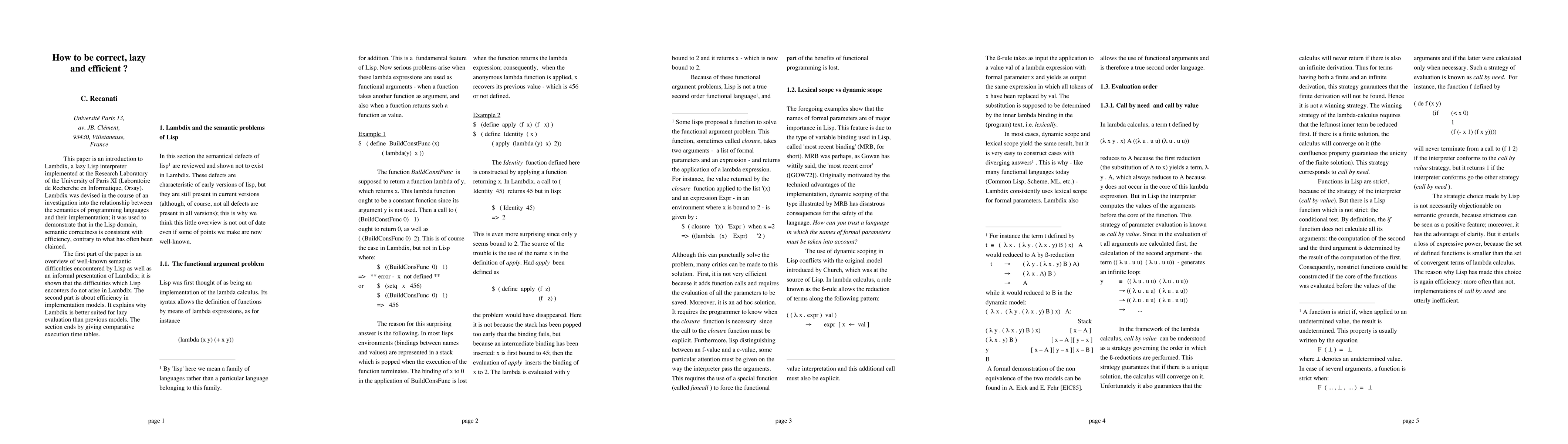 This paper is an introduction to Lambdix, a lazy Lisp interpreter implemented at the Research Laboratory of Paris XI University (Laboratoire de Recherche en Informatique, Orsay). Lambdix was devised in the course of an investigation into the relationship between the semantics of programming languages and their implementation; it was used to demonstrate that in the Lisp domain, semantic correctness is consistent with efficiency, contrary to what has often been claimed. The first part of the paper is an overview of well-known semantic difficulties encountered by Lisp as well as an informal presentation of Lambdix; it is shown that the difficulties which Lisp encouters do not arise in Lambdix. The second part is about efficiency in implementation models. It explains why Lambdix is better suited for lazy evaluation than previous models. The section ends by giving comparative execution time tables.