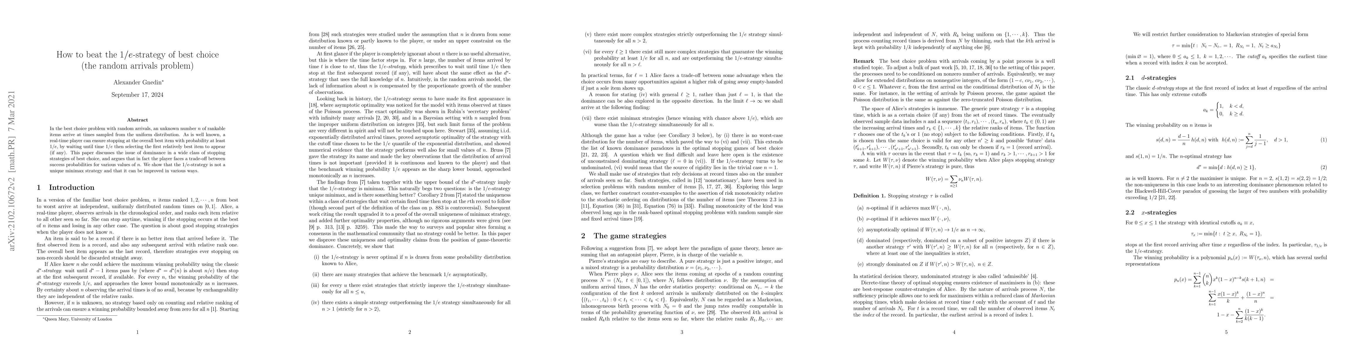 This paper explores strategies for improving upon the $1/e$-strategy in the best choice problem with random arrivals, demonstrating that there is a trade-off in success probabilities for different values of $n$ and that the $1/e$-strategy is not the only optimal minimax approach. The authors propose alternative strategies that can outperform the $1/e$-strategy under certain conditions.