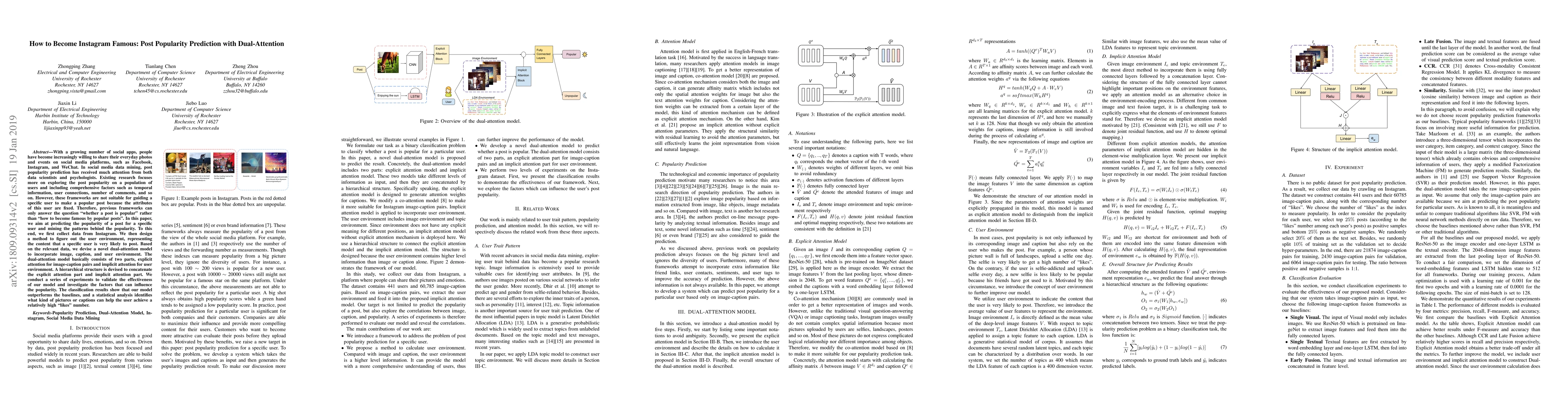 With a growing number of social apps, people have become increasingly willing to share their everyday photos and events on social media platforms, such as Facebook, Instagram, and WeChat. In social media data mining, post popularity prediction has received much attention from both data scientists and psychologists. Existing research focuses more on exploring the post popularity on a population of users and including comprehensive factors such as temporal information, user connections, number of comments, and so on. However, these frameworks are not suitable for guiding a specific user to make a popular post because the attributes of this user are fixed. Therefore, previous frameworks can only answer the question "whether a post is popular" rather than "how to become famous by popular posts". In this paper, we aim at predicting the popularity of a post for a specific user and mining the patterns behind the popularity. To this end, we first collect data from Instagram. We then design a method to figure out the user environment, representing the content that a specific user is very likely to post. Based on the relevant data, we devise a novel dual-attention model to incorporate image, caption, and user environment. The dual-attention model basically consists of two parts, explicit attention for image-caption pairs and implicit attention for user environment. A hierarchical structure is devised to concatenate the explicit attention part and implicit attention part. We conduct a series of experiments to validate the effectiveness of our model and investigate the factors that can influence the popularity. The classification results show that our model outperforms the baselines, and a statistical analysis identifies what kind of pictures or captions can help the user achieve a relatively high "likes" number.
