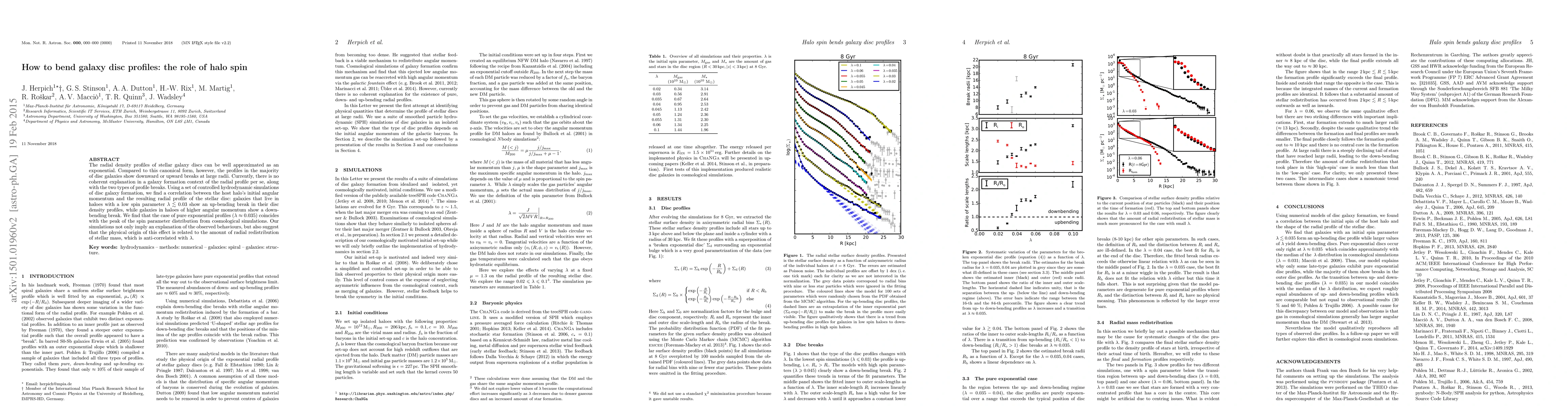 Galaxy discs' radial density profiles show breaks at large radii, which can be explained by halo spin; galaxies with low-spin halos have up-bending breaks, while those with high-spin halos have down-bending breaks.