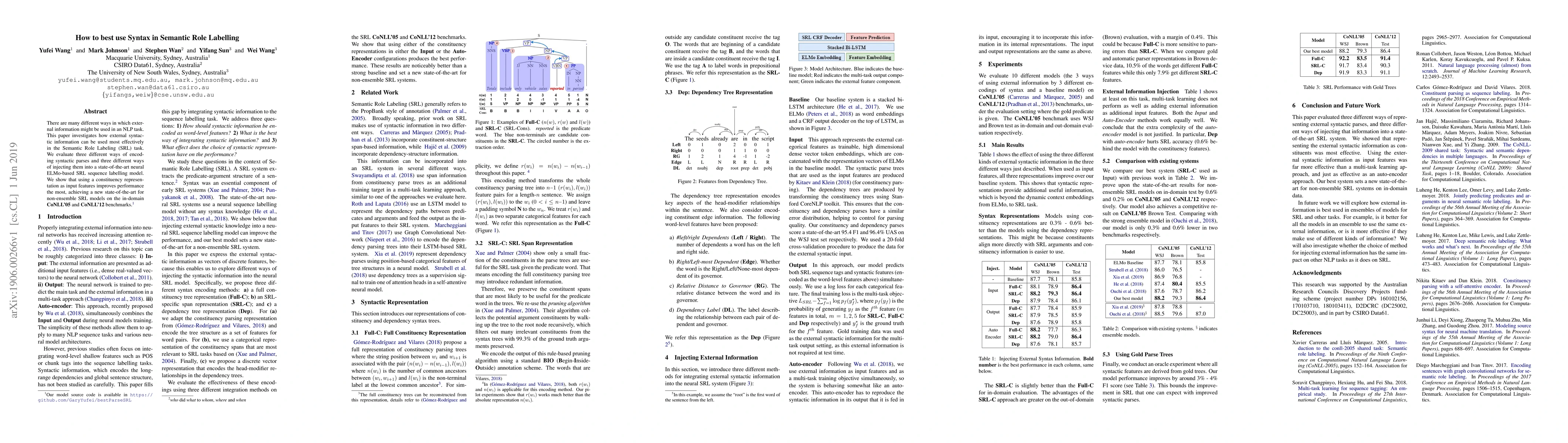 There are many different ways in which external information might be used in an NLP task. This paper investigates how external syntactic information can be used most effectively in the Semantic Role Labeling (SRL) task. We evaluate three different ways of encoding syntactic parses and three different ways of injecting them into a state-of-the-art neural ELMo-based SRL sequence labelling model. We show that using a constituency representation as input features improves performance the most, achieving a new state-of-the-art for non-ensemble SRL models on the in-domain CoNLL'05 and CoNLL'12 benchmarks.